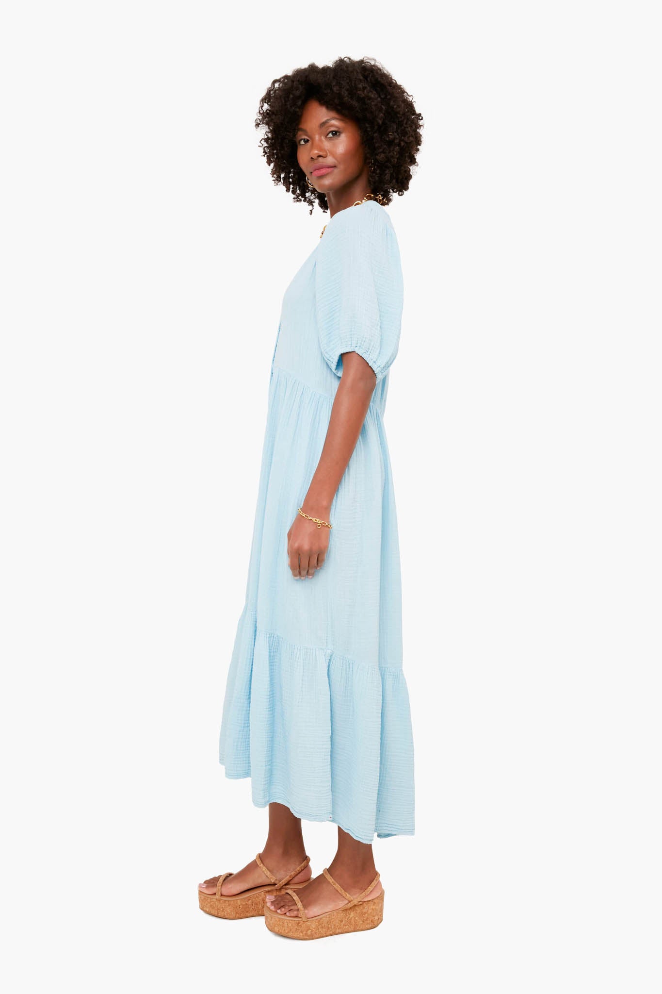 The Cyprus Blue Lennox Dress is cut from soft cotton gauze with a button-down tiered silhouette. A swingy, easy fit (with pockets!) will have you dreaming of breezy beach days and backyard BBQs. This bright pop of color is sure to brighten your day- just add sandals and gold jewelry!