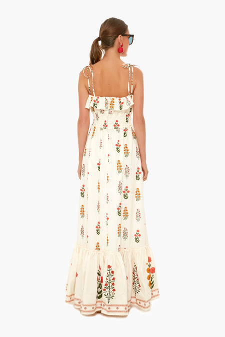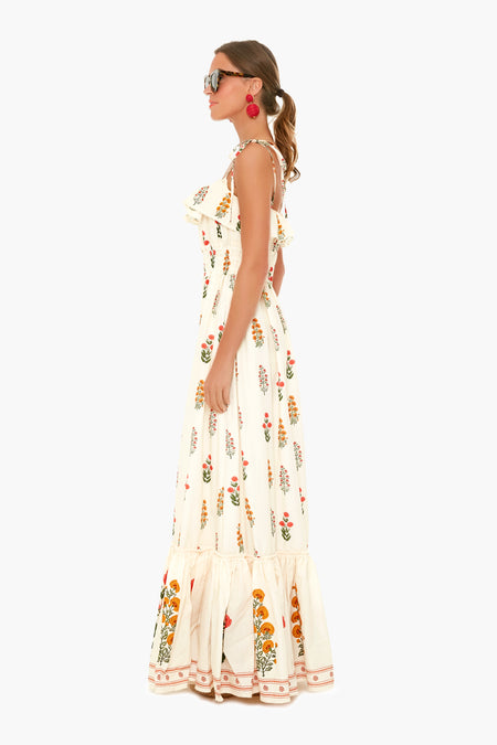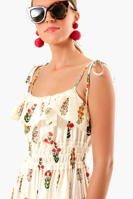 The Dahlia Coco Poplin Maxi Dress features a ruffle square neckline, tie shoulder details, and a smocked waist. With a tiered maxi skirt and hand-embroidered floral details, this style is breezy and beachy. Pair with raffia accessories for a boho glam date night look.