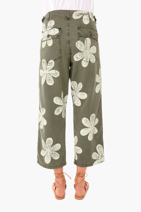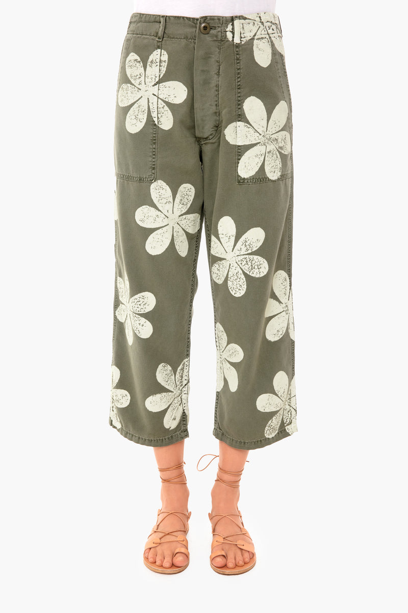 The Daisy Stamp Vintage Army Pant is inspired by military pants with floral embroidery details. This style can be worn high on the waist cinched with a belt or looser on the hips for a cool-girl flair. We are wearing them a tee and raffia accessories for a beachy vibe.