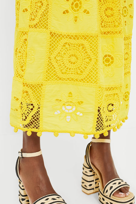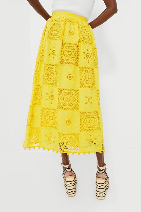 The highly textured, elevated Dandelion Lamar Skirt embodies a must have item of the season. With a vibrant yellow hue and pom-pom trim at the hem, the real beauty lies in the intricate crochet detailing that adorns the entirety of the full silhouette. Pair with a body suit and heels or a blouse and sandals for an eye-catching ensemble!