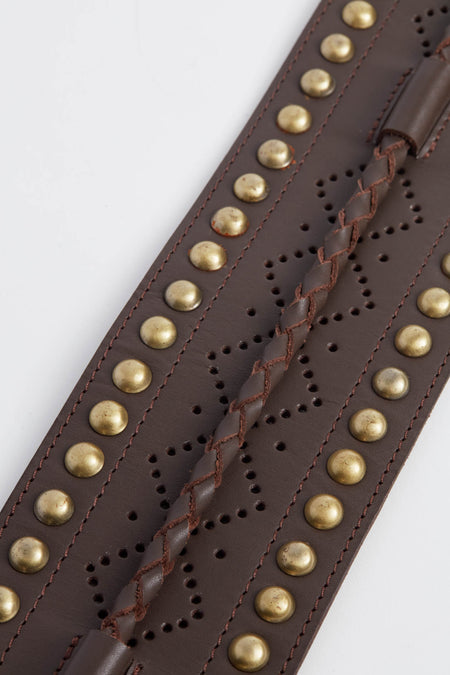 Made from a supple leather, the Dark Brown Leather Belt is meant to sit high on the waist for a flattering styling. With a self-tie closure that can be adjusted for a perfect fit, this style is detailed with a hand-stamped cutout design, gold-tone studs, and a braided leather closure with tassels. Wear yours cinched over an oversized blouse or a floaty dress for a cool-girl Western-inspired look.