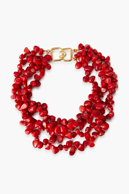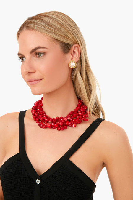 The Dark Coral Necklace is a multi-strand style, strung with red resin beads, each lovingly polished to showcase their natural striations. It's finished with a gold-plated closure for added shine and style. Pair this beauty with blue and white stripes for festive BBQs and cocktail parties!