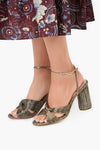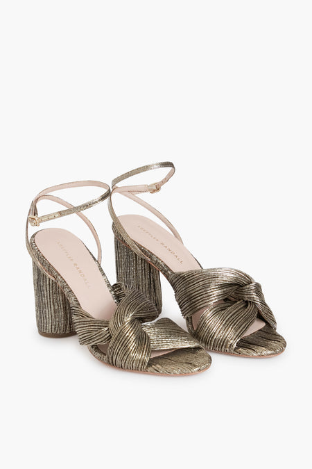 The Dark Gold Lamé Reed Heels are a glitzy and glamorous shoe fit for dressy occasions. With a metallic pleated twist detail, a thin ankle strap, and a block heel, these shoes are made for dancing the night away! Pair with an LBD or a longer gown, then add gold jewelry and a clutch for an elegant evening look.
