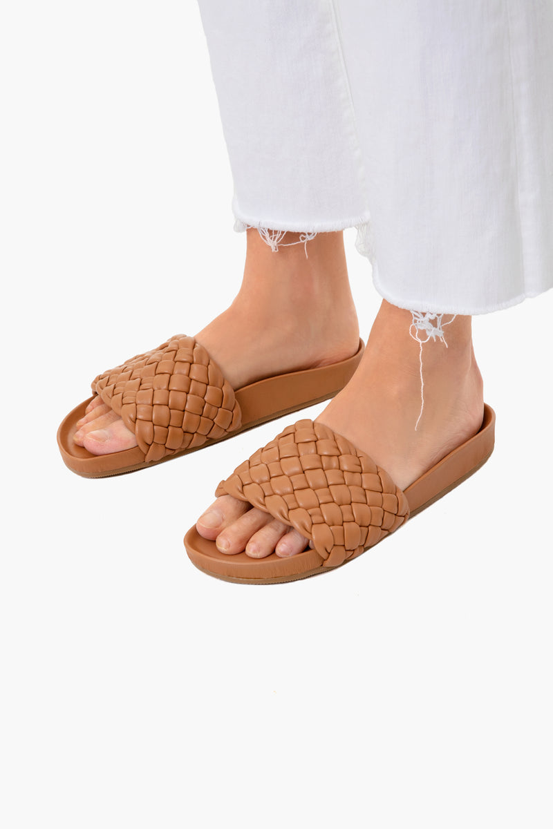 The Dark Sand Sonnie Flat Sandal is made from woven dark tan leather with a wrapped, padded footbed. Perfect for school drop-offs, afternoon walks at a sculpture garden, or a quick run to the local market, these slides will pair easily with any outfit!