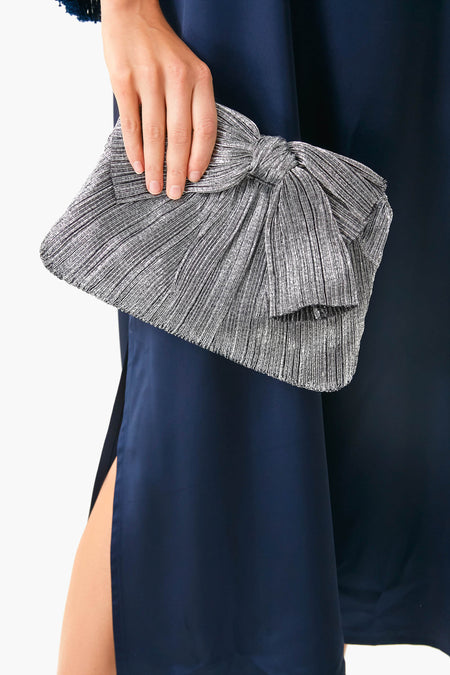 The Dark Silver Lame Rayne Clutch is the perfect bag for when you need to bring a few essentials along and want to add some shine to your outfit. Featuring a removable twisted silver chain crossbody strap, frame closure, and a signature bow detail, you'll want to grab this accessory every time you go out. Pair with denim to add some fun flair to a simple look or carry it along to events with a LBD.