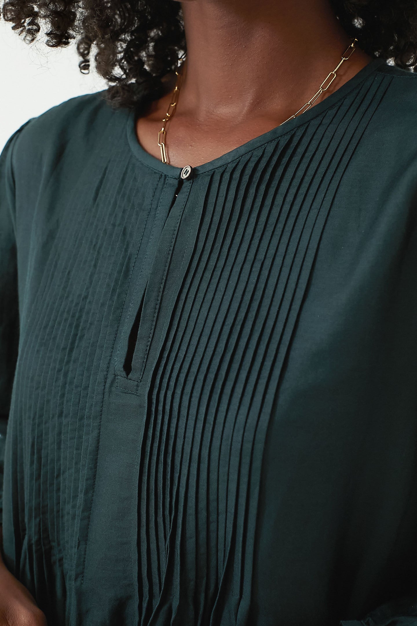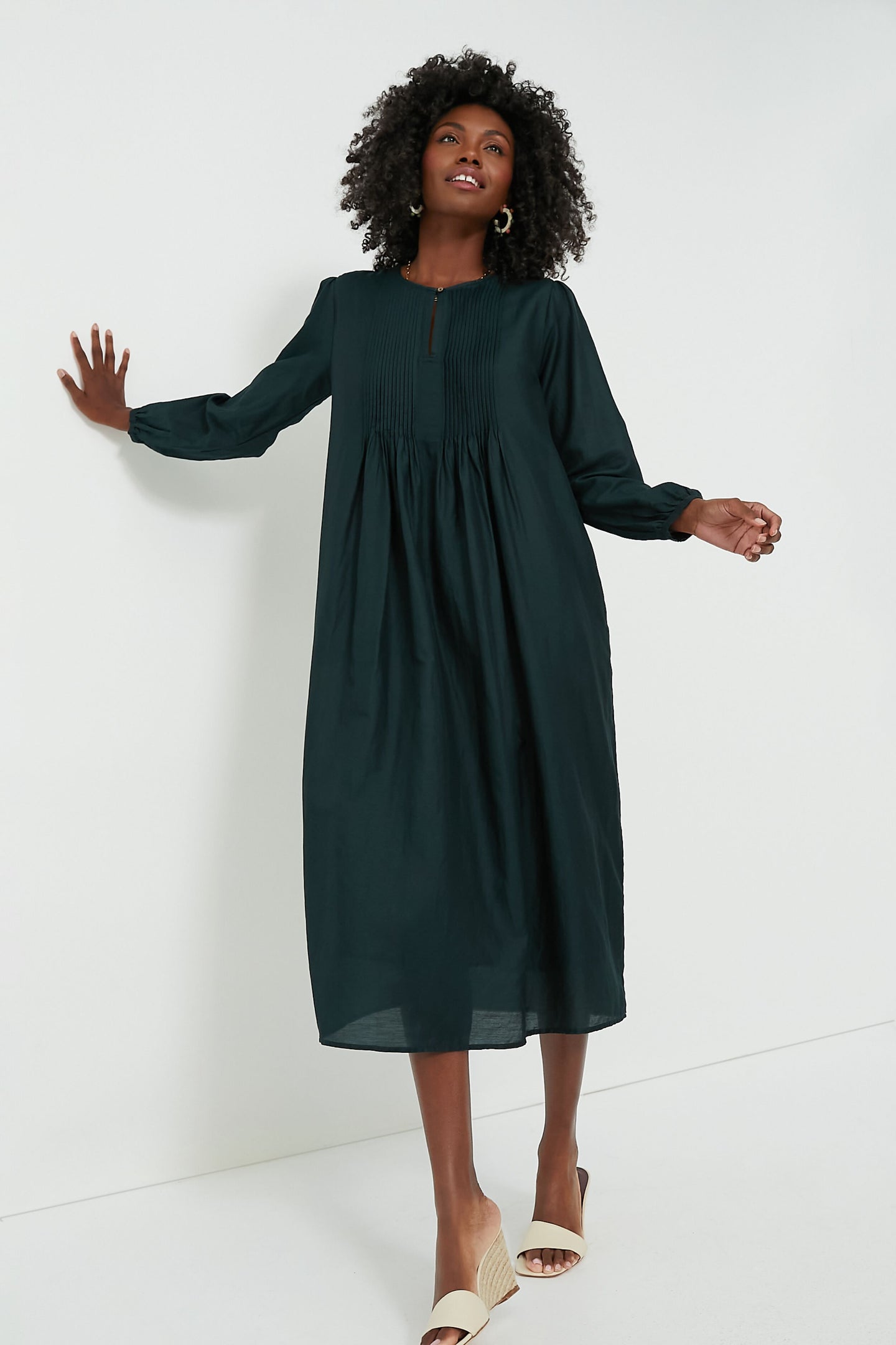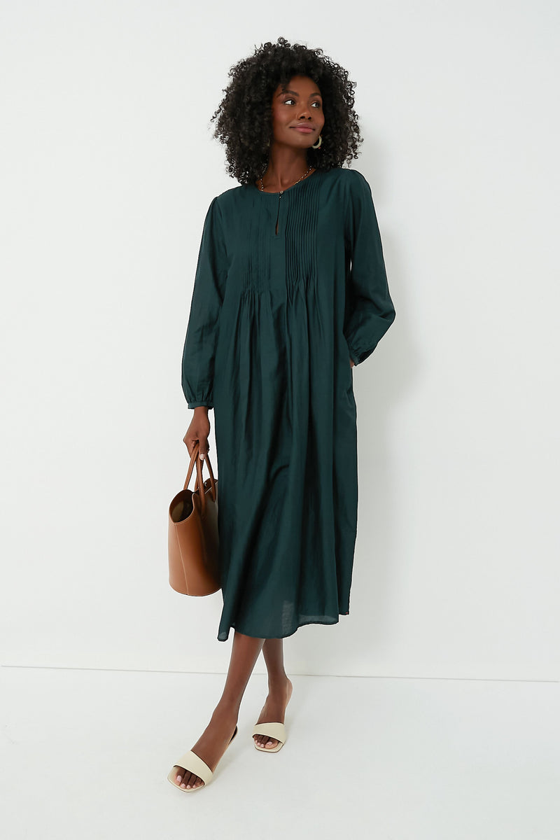 Boasting a beautifully rich teal hue, the Marta Dress is one of our favorites! The elegant blouson sleeves and sharp pintucks along the bodice bring shape and structure to this relaxed silhouette cut from a sumptuous blend of cotton and silk. Perfect for everyday wear, we are styling this piece with flats or boots, statement earrings, and a shoulder bag for back-to-school events and nights spent with friends.