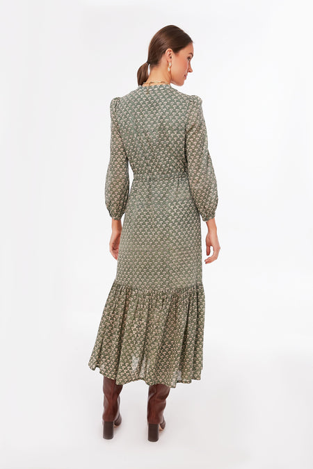 Fall in love with the crisp gray sky with the Day Flowers Juniper Frances 2 Dress. In a gorgeous muted hand block printed green hue, this midi dress features a mandarin collar, a subtle shoulder puff, and a tiered skirt. This fall number is begging to be worn with boots while you catch up with friends over lunch followed by a little retail therapy.