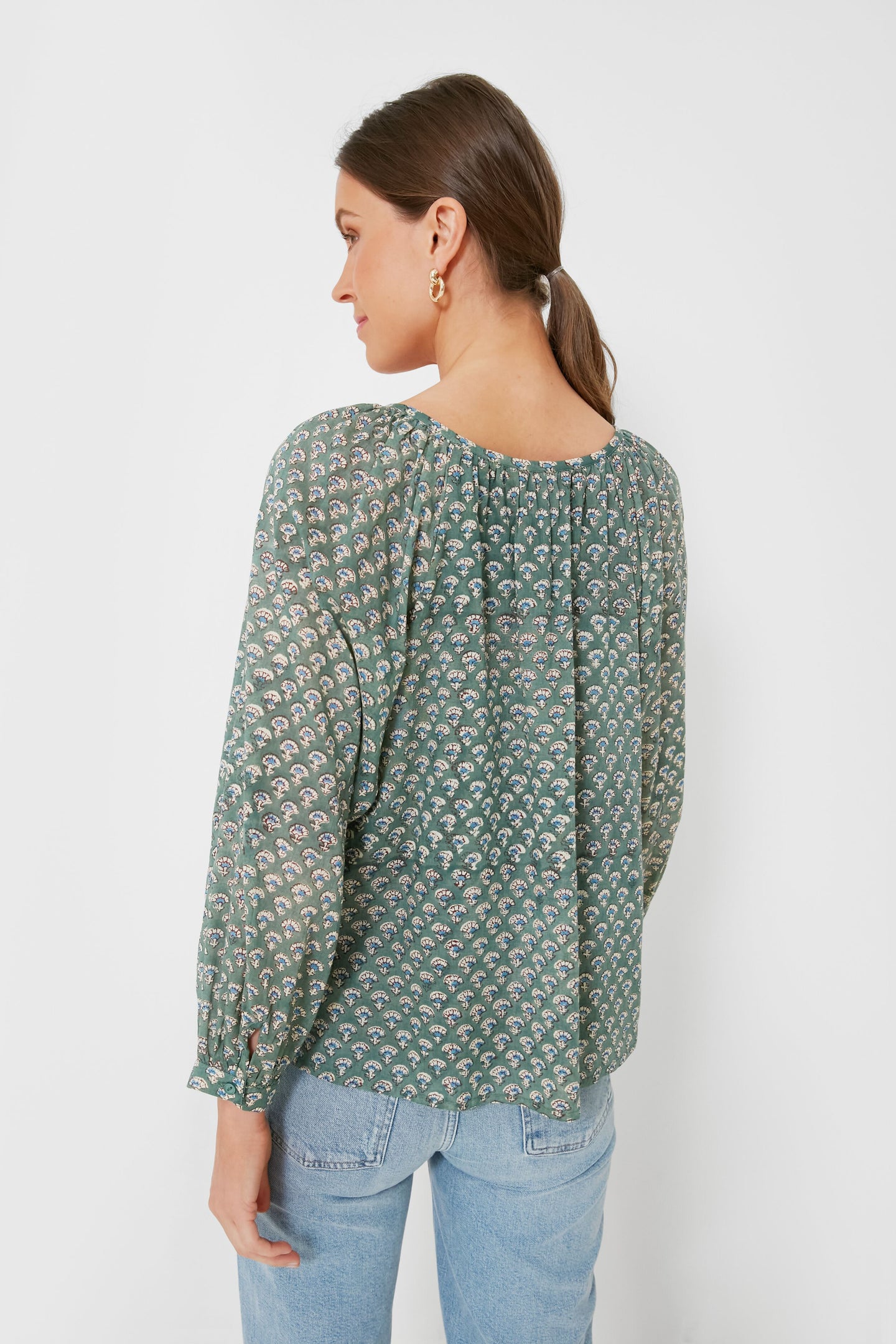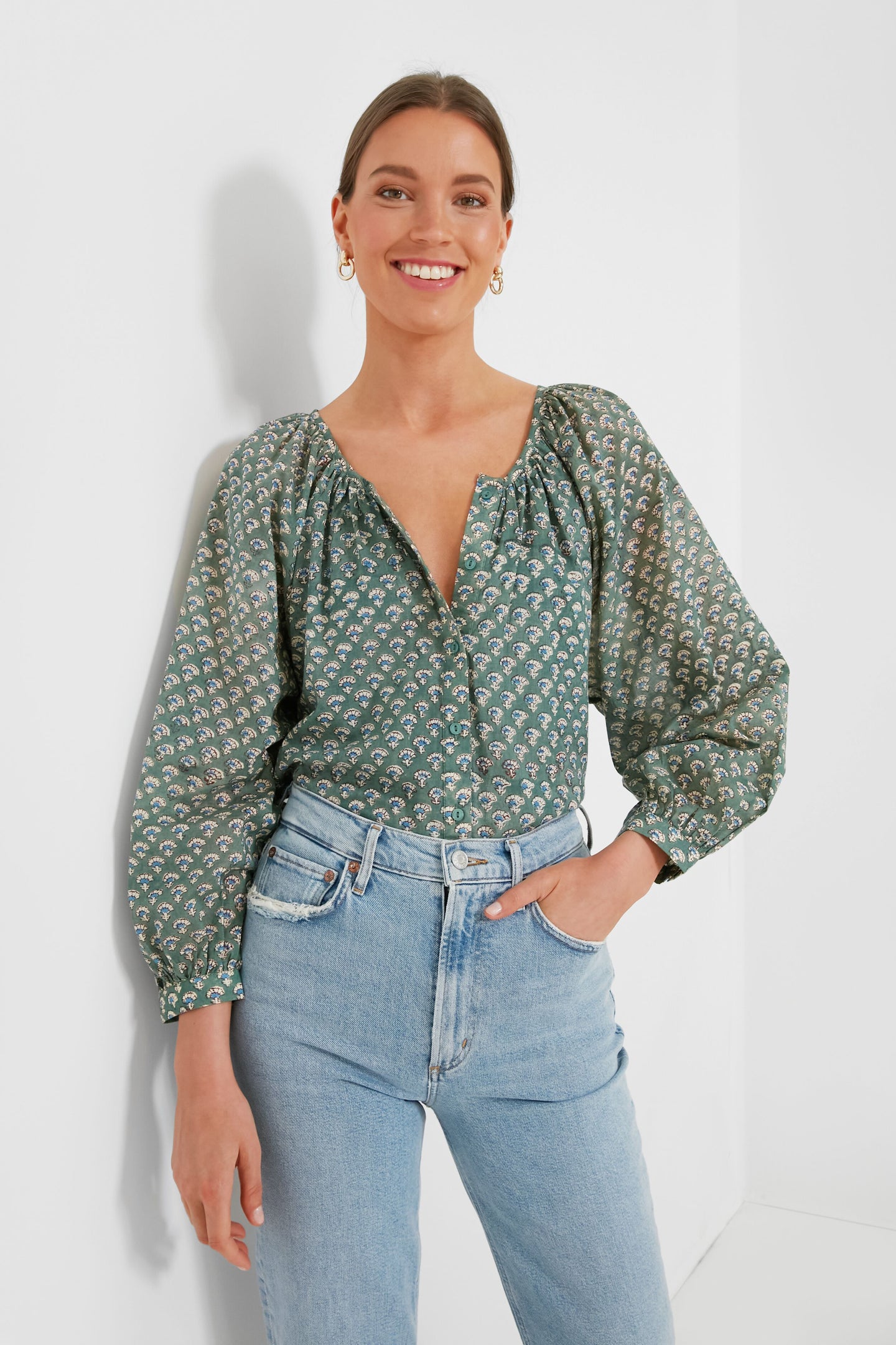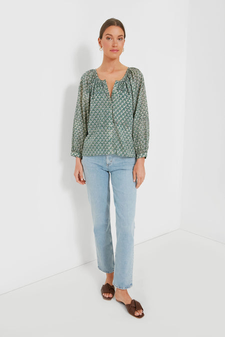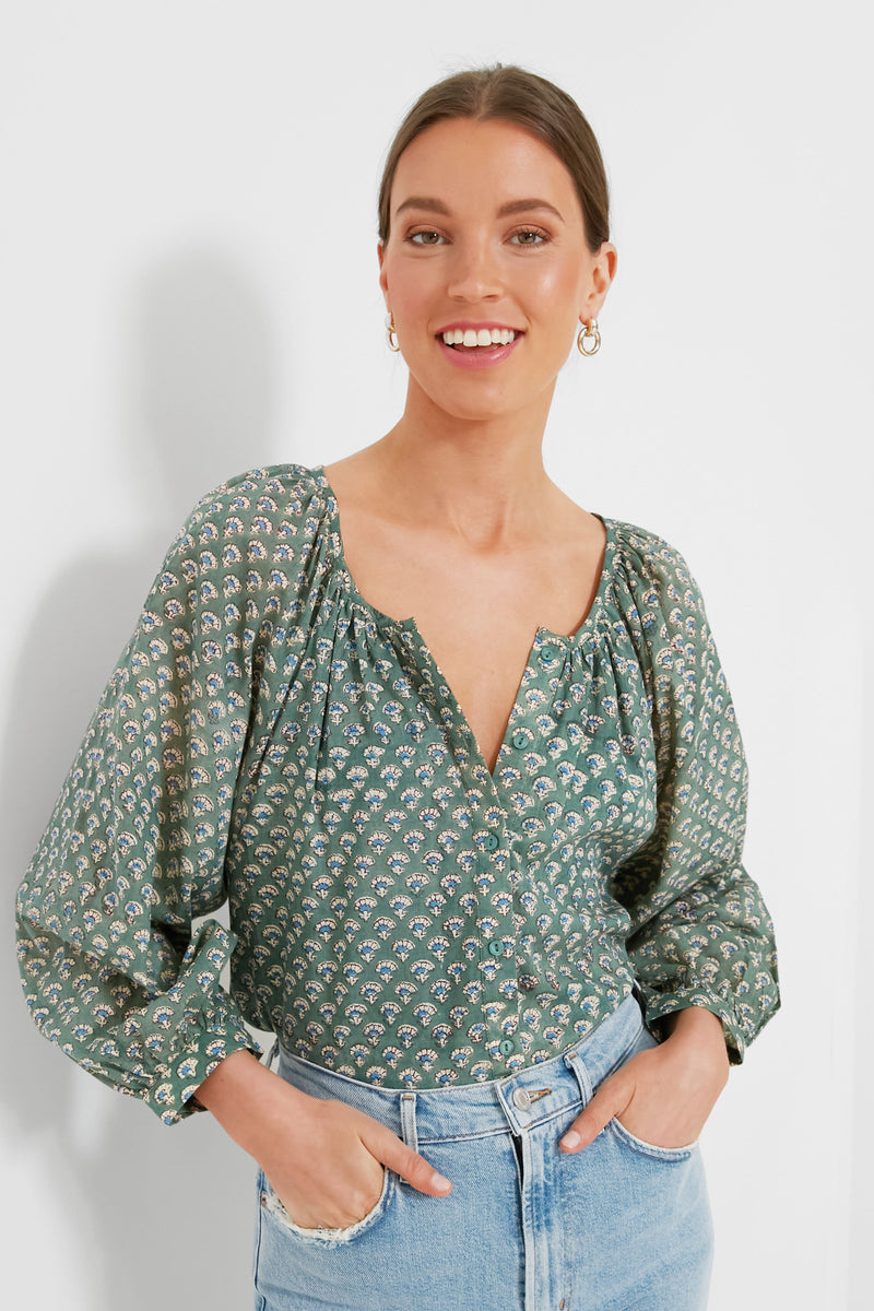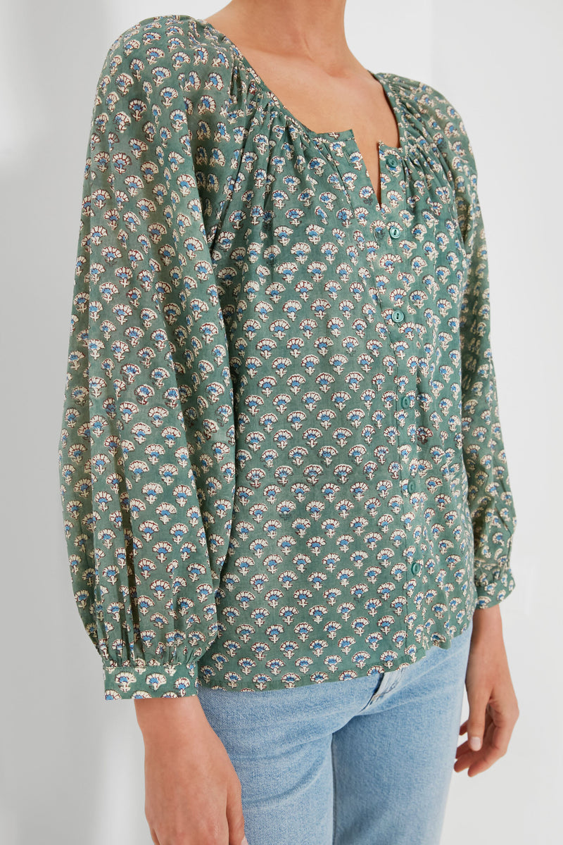 The Day Flowers Juniper Frances Blouse is made from breezy organic cotton in a stunning sage hue printed with cheerful wildflowers. This style features a button front, shirred body, and blouson sleeves with button cuffs. Perfect for weekend strolls through the farmers’ market and brunch with friends, we are pairing this with all shades of denim, sandals, and a chic beach bag for a boho-inspired look.