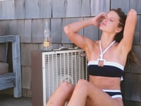 Made from two-tone tricot, the Poppy bikini top is a bandeau style defined by a square center cutout, contrast trim, and a removable halter-neck tie. Pair with the matching Deep Navy White Stripe Lana Bottoms and an oversized sun hat for a chic beachside look!