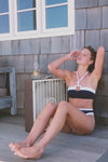 Made from two-tone tricot, the Poppy bikini top is a bandeau style defined by a square center cutout, contrast trim, and a removable halter-neck tie. Pair with the matching Deep Navy White Stripe Lana Bottoms and an oversized sun hat for a chic beachside look!