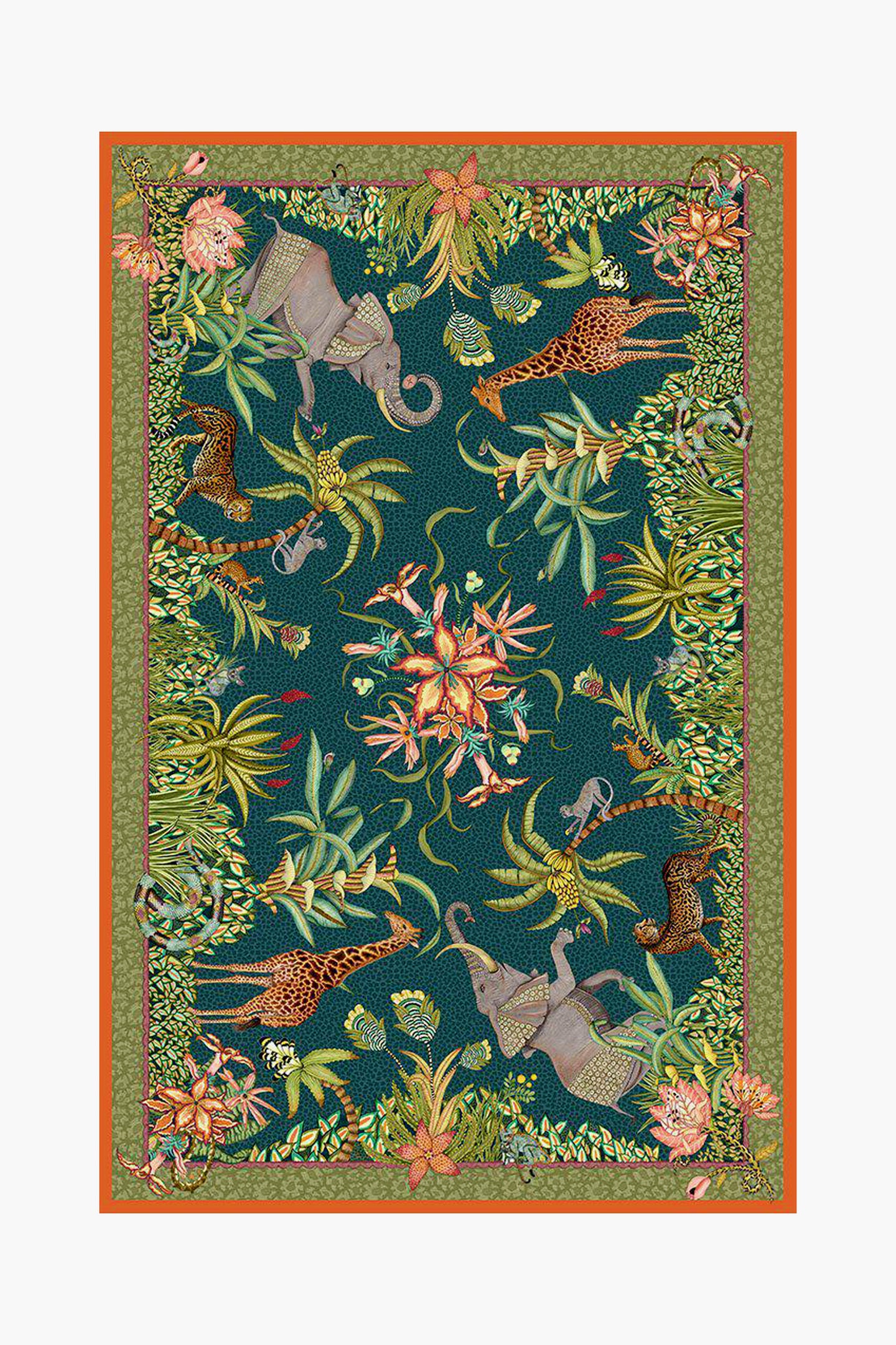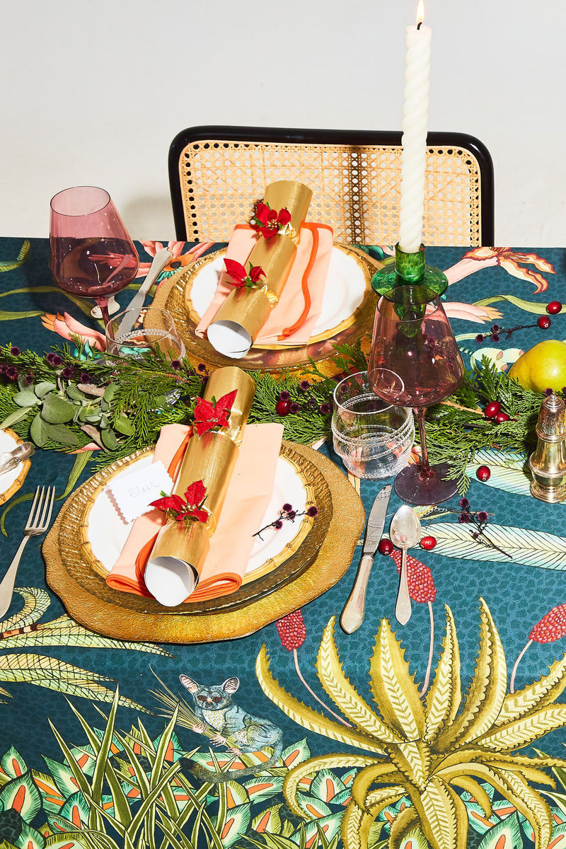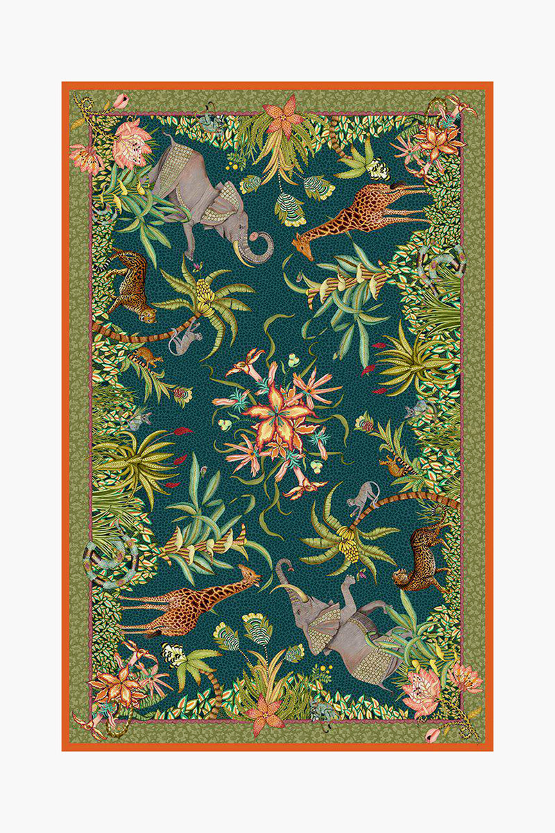 The Delta Sabie Tablecloth showcases a lush palette of rainforest green with pops of ochre, scarlet, and orange. Use this tapestry of foliage and camouflaged creatures to elevate your tablescape and add whimsical color. Perfect for either square or rectangular tables, this piece will be treasured for years to come.