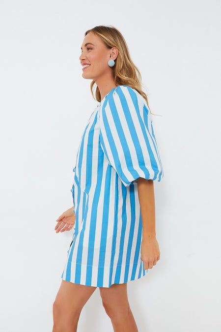 The Dorsey Stripe Grande Paloma Dress is a fun and whimsical style in a classic blue and white striped fabric. Cut from 100% Cotton in an oversized fit, this mini features a round gathered neckline, balloon puffed sleeves, and a crisp shift silhouette. Pair with white sneakers and pearl earrings for a casual lunch date look, or with platform sandals and a clutch for brunch with the girls.