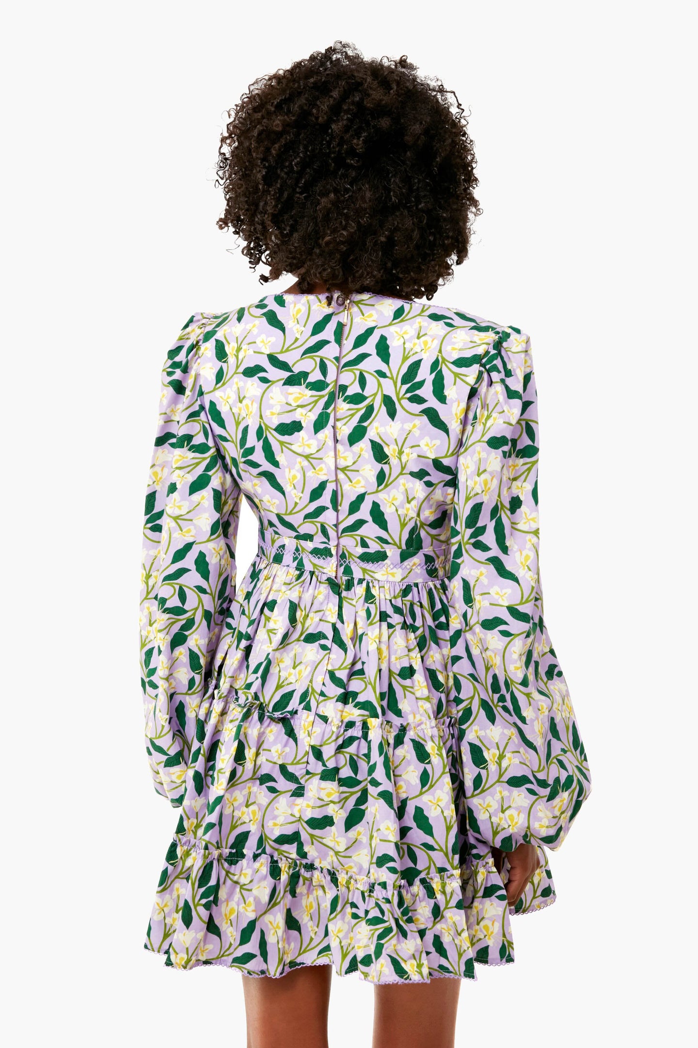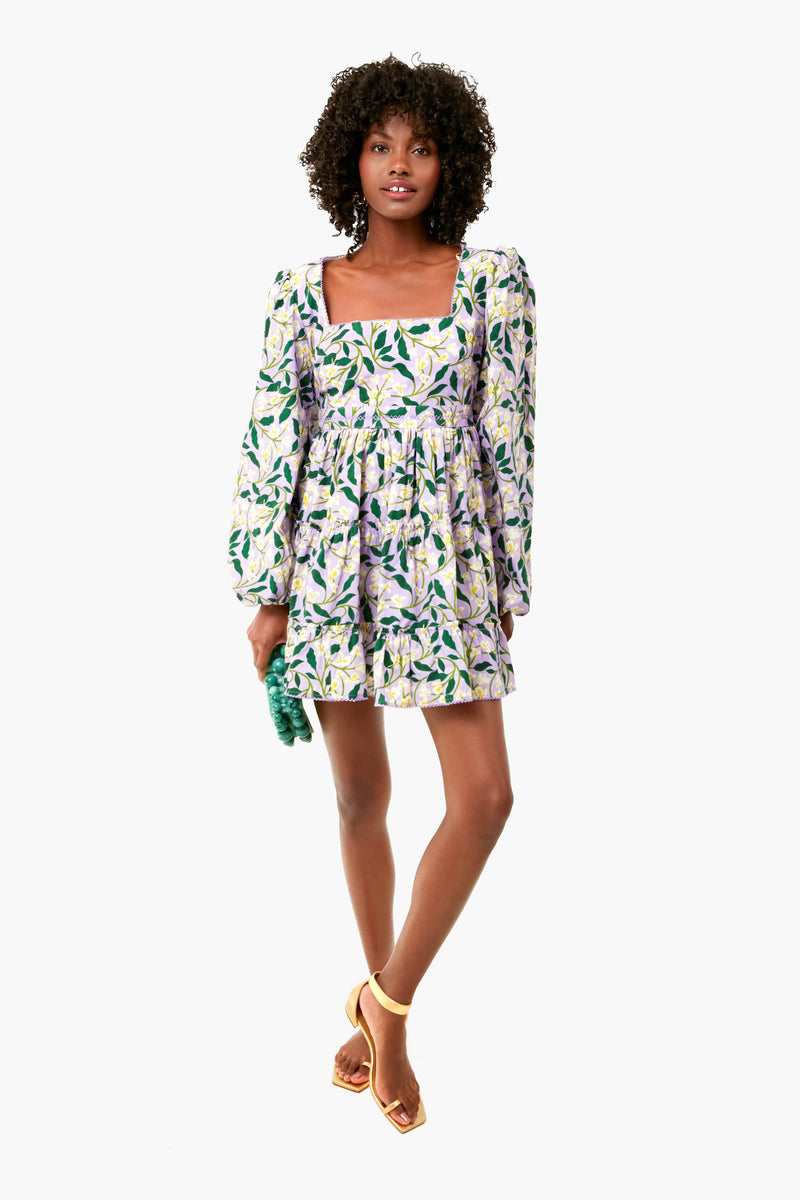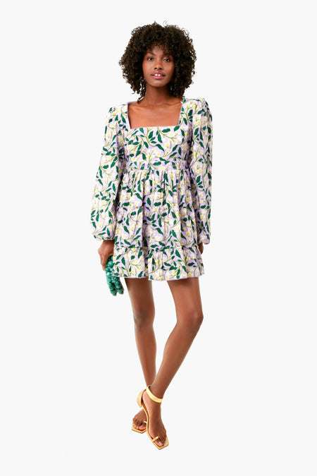 The Dos Gardenias Avena Dress has a square neckline, voluminous long sleeves, and a flouncy tiered mini skirt. Made from crisp cotton poplin and printed with lavender, yellow and green gardenia motif, this style is timeless and feminine. We are adding sandals and statement earrings for special celebrations!