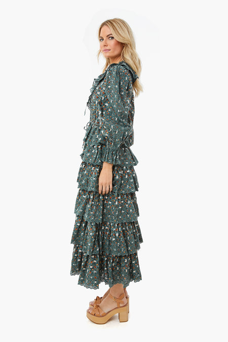 The Odile Dress is a season stand-out, made from a small-scale floral print that is finished with dense eyelet trim which adorns each layered skirt tier, collar, and cuff. No detail spared, this midi-length dress features full sleeves, a split neckline with layered ties, and an elastic drawstring waistband. Add a clutch and heels for a boho-inspired party look!