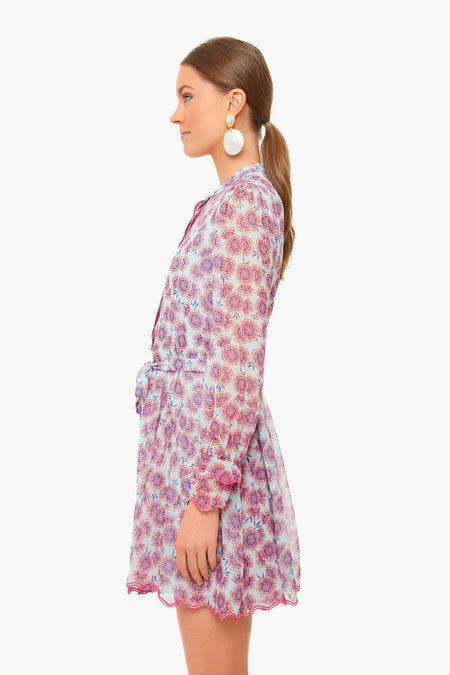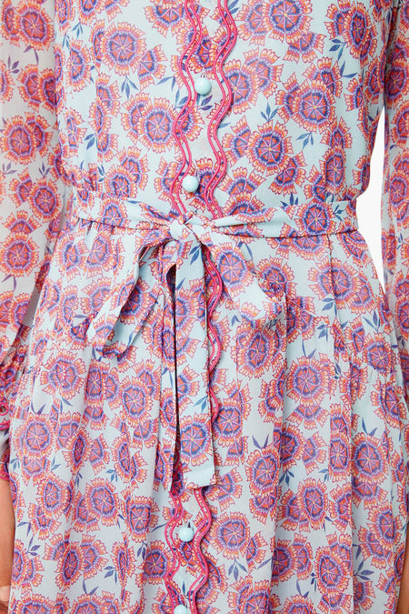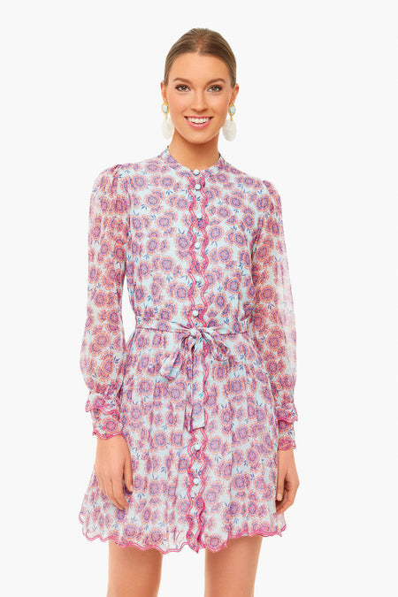 The Tilly Dress is cut from a groovy ciel dragonfruit print on luxe silk. Featuring a shirt dress style with a delicately ruffled bodice, relaxed silhouette, optional self-tie belt, covered buttons, and a scalloped hem- this style spares no detail. Add heels and statement earrings for everything from work to bridal showers.