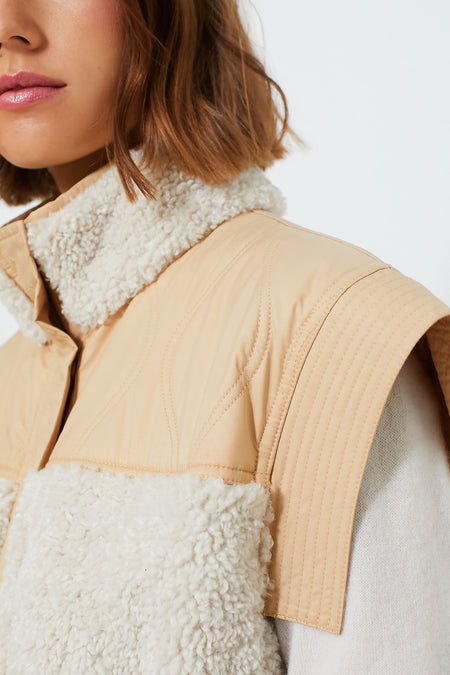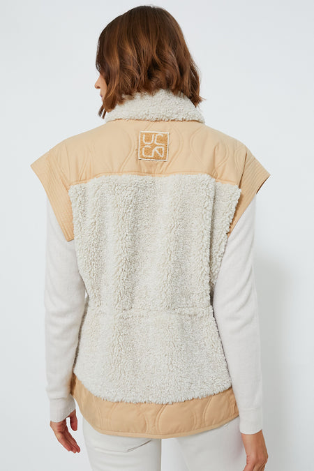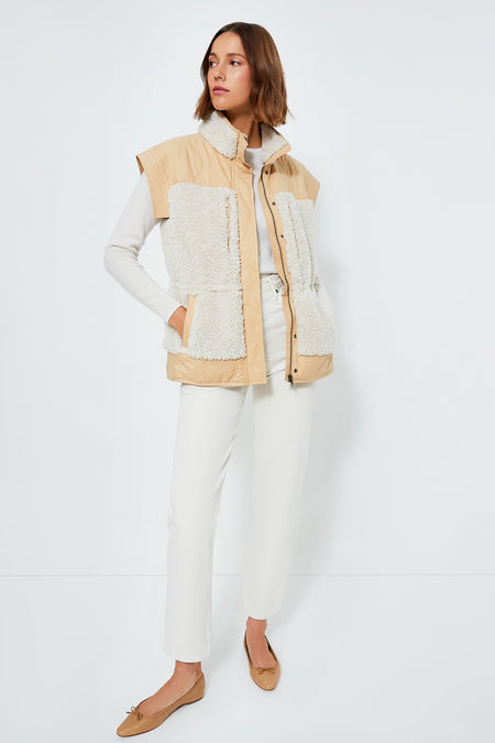 The Driftwood Shiloh Vest is a stylish addition to your wardrobe. This chic oversized silhoeutte features short sleeves with trapunto stitching, a stand collar with a front zip closure, and sherpa material throughout the front and back. Pair with simple denim and a long sleeve for an eye-catching look.