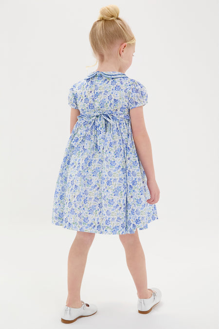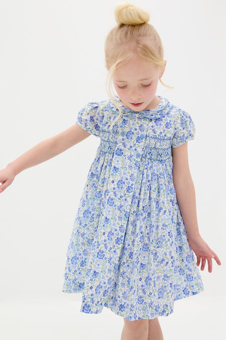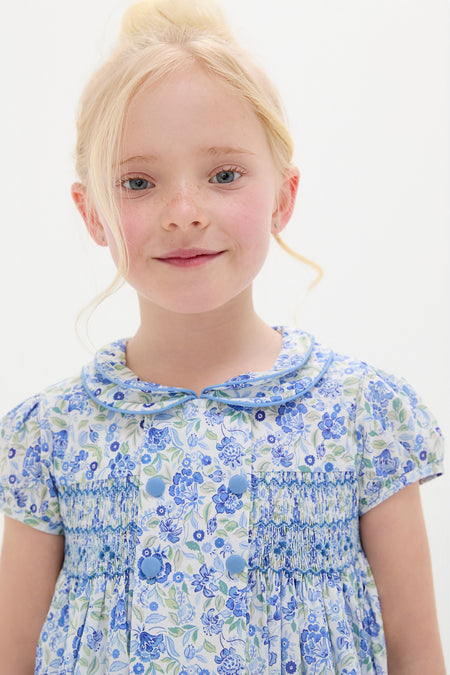No detail was left behind when designing the Dusty Blue Floral Arcadia Hand-Smocked Dress. With intricate hand-smocked detail across the empire line waist, traced with geometric embroidery in contrasting thread, finished with short capped puff sleeves, and a charming layered Peter Pan collar, this dress is a must for those picture moments family moments.