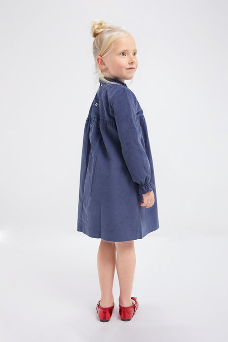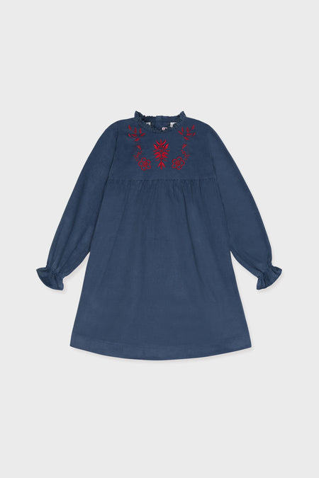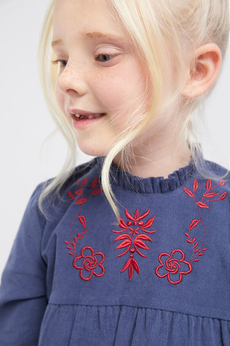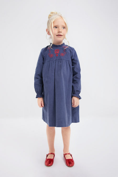 Crafted from a sumptuous pure cotton corduroy, offering a soft and luxurious feel, this Dusty Blue Roberta Dress has a stylish collar, eye-catching red embroidery, making it the perfect for family get-togethers and after school activities, your kiddo will look and feel their best in this mini!