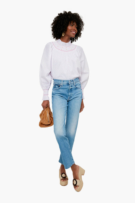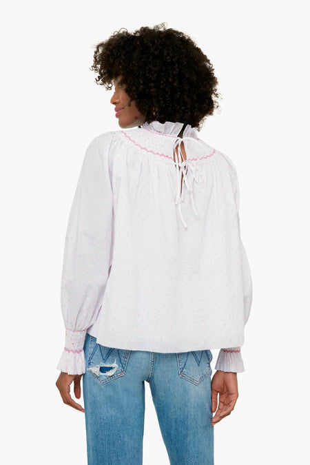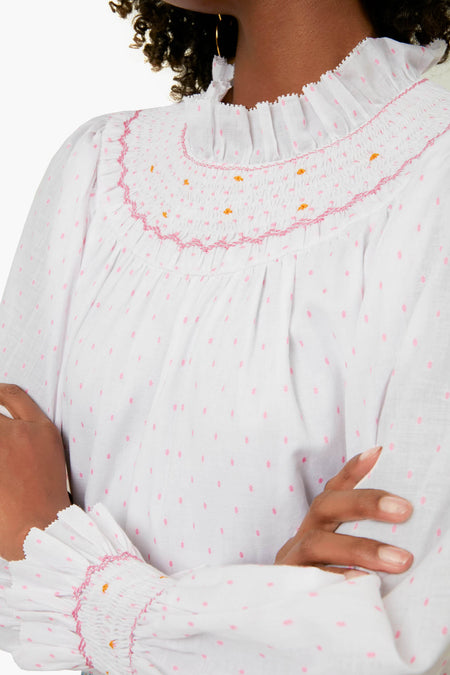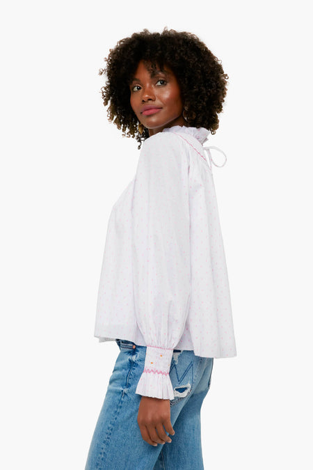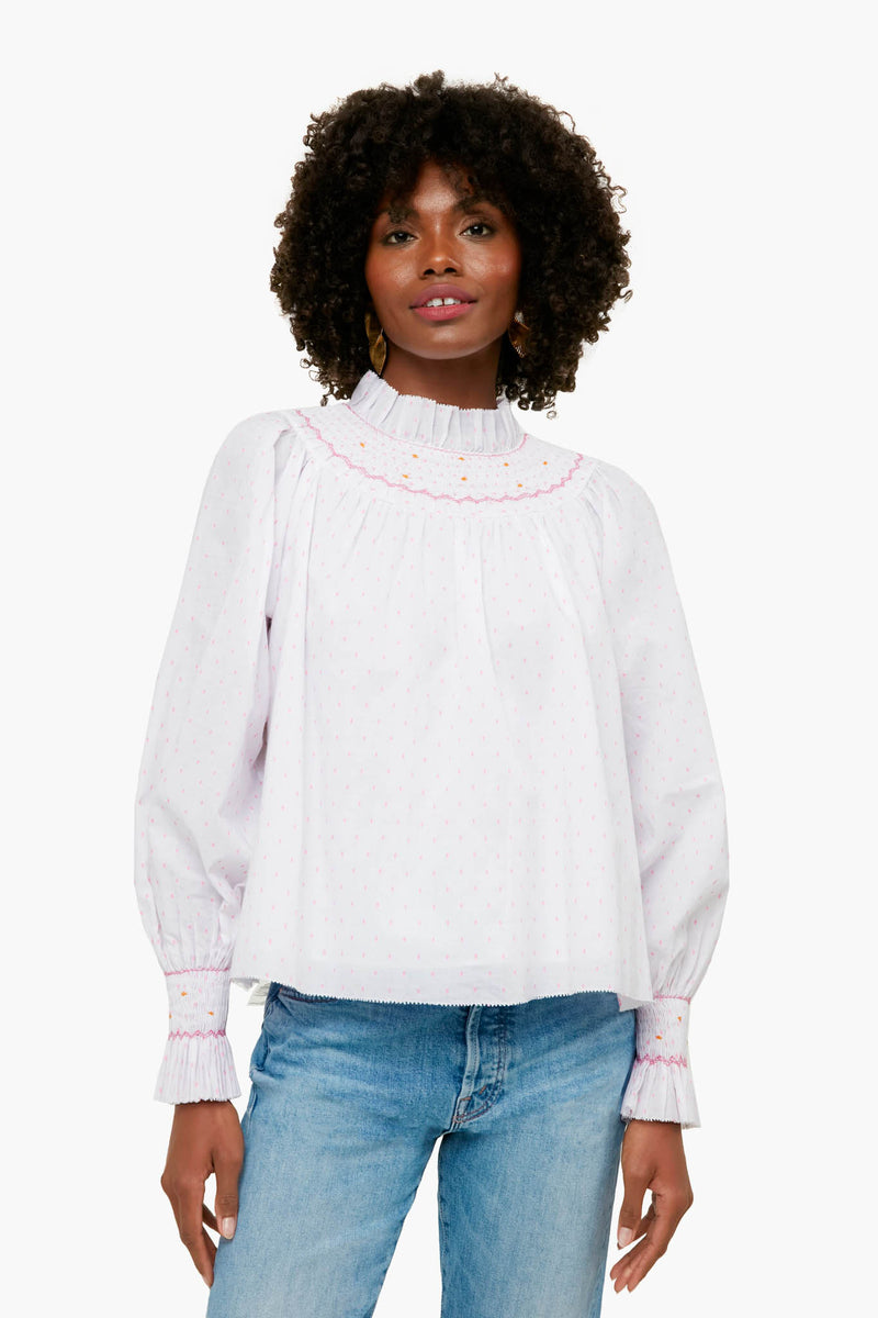 The Electric Pink Hayes Blouse is a mock neck style top, featuring billowy sleeves with a smocked bodice and cuffs. Colorful and unique, this blouse is made from a clip dot fabric with colorful embroidery. Pair with denim and sandals for a chic and feminine look.