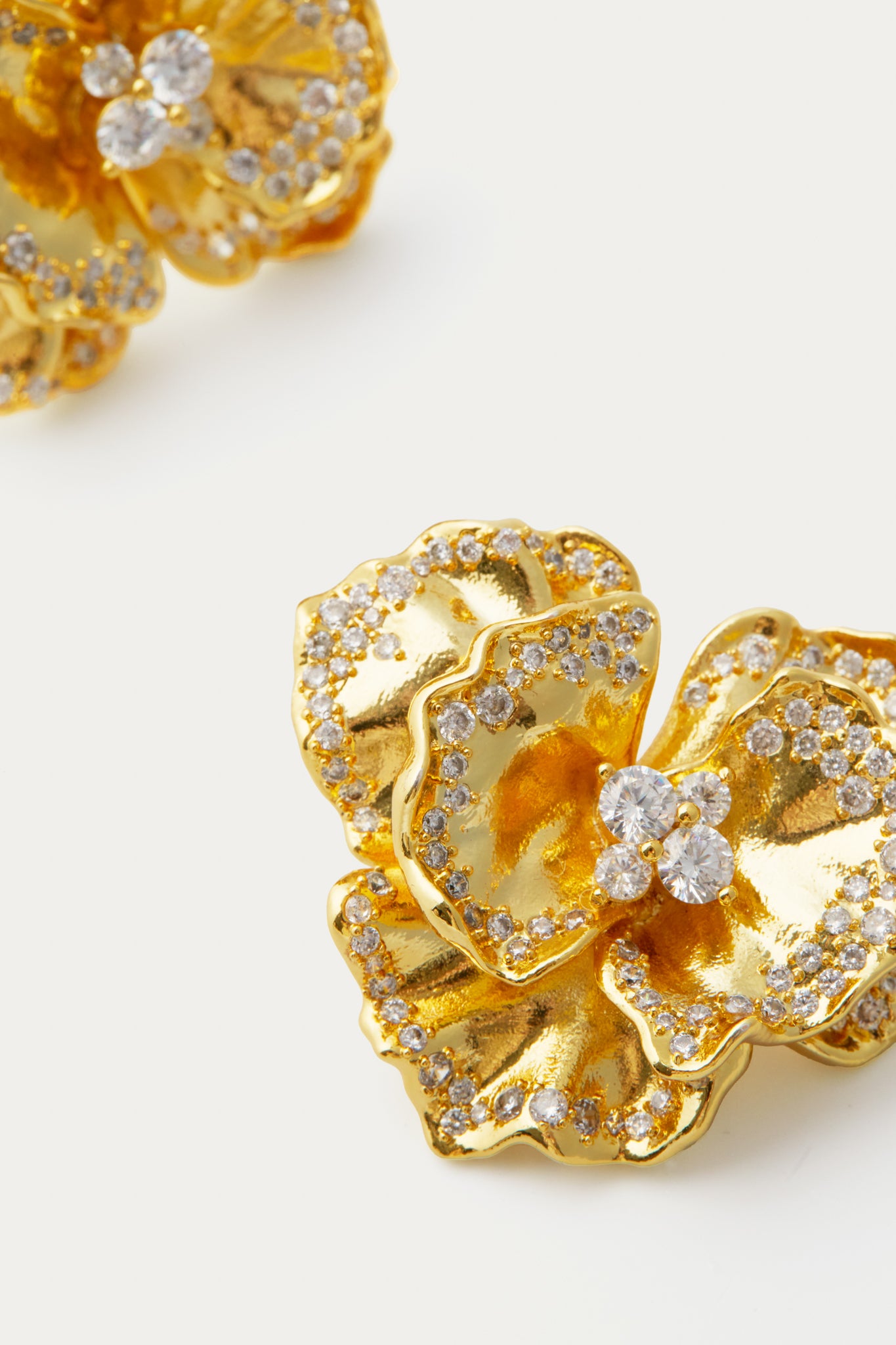 The Embellished Golden Pansy Earrings are an exquisite style that will add a touch of elegance to your outfit. A stud silhouette boasting flower shape with gleaming center, this elegant number is equal parts feminine and sophisticated. Pair with everything from a blouse and skirt to a sweater and denim.