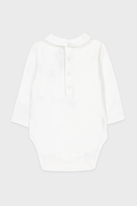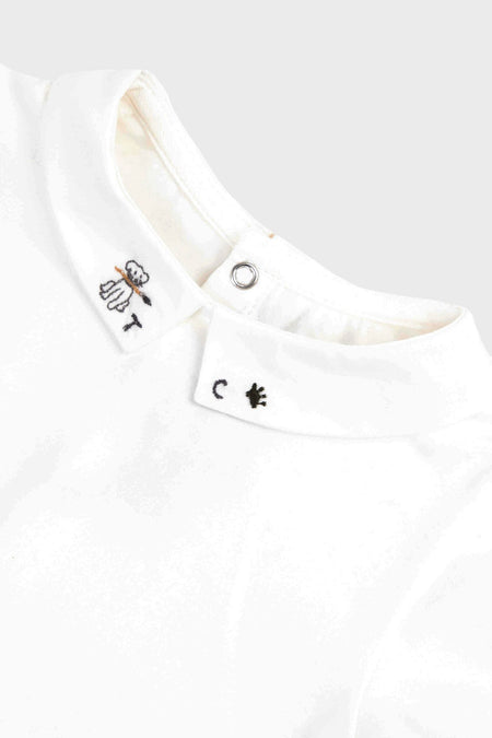 This creamy white bodysuit with adorable embroidery on collar is ideal for every day wear. The press studs on the back and between the legs allow easy dressing. Perfect for layering or on its own, pair them with a cozy sweater or under overalls for an effortlessly cute look perfect for playdates or family outings.