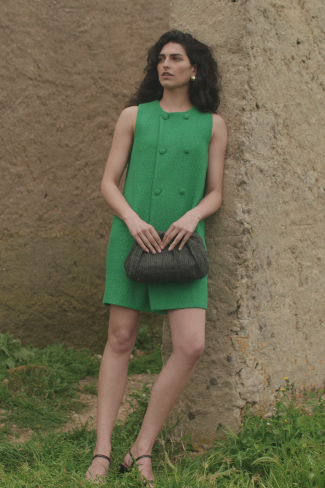 Shine like a jewel in the Emerald Green Tweed Bianca Dress. This chic style is a feminine mini with a straight silhouette, double-breasted front buttons, and functional side pockets. The soft, heavyweight tweed fabric is absolutely luxe, making it a perfect style to dress up or down. Style with flats and a headband for a Parisian street-style look, or with heels and jewelry for a dinner party.