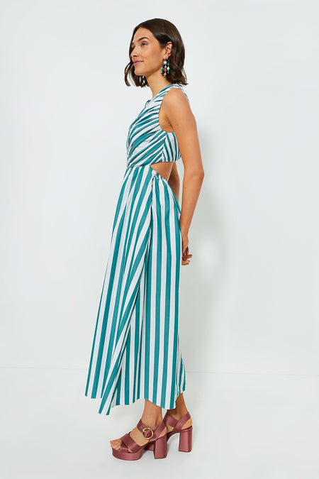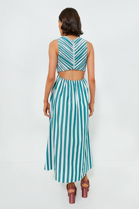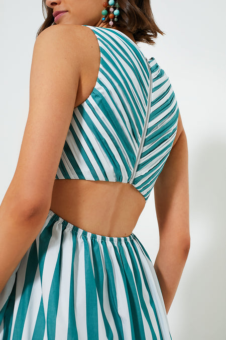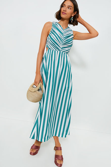 We are loving the Kathleen dress in stunning emerald green striped cotton. This midi-length showstopper is sure to turn heads with its ruched bodice, shirred skirt, and cut-out elastic back waist detailing. Effortlessly chic and brimming with style, it's the perfect choice for making a statement at any summer occasion.