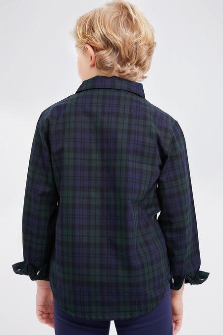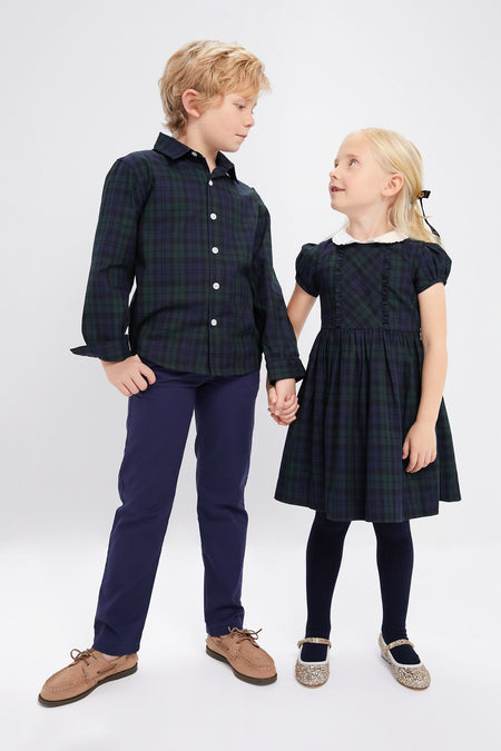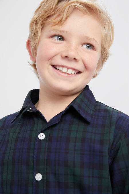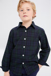 Keep your little one looking sharp in the Blackwatch Button Down Shirt! Its classic collar, green and blue plaid pattern make for a look that's timeless and festive - the perfect way to stay on trend all year round. Get your tiny trendsetter ready for the festivities with this outfit essential!