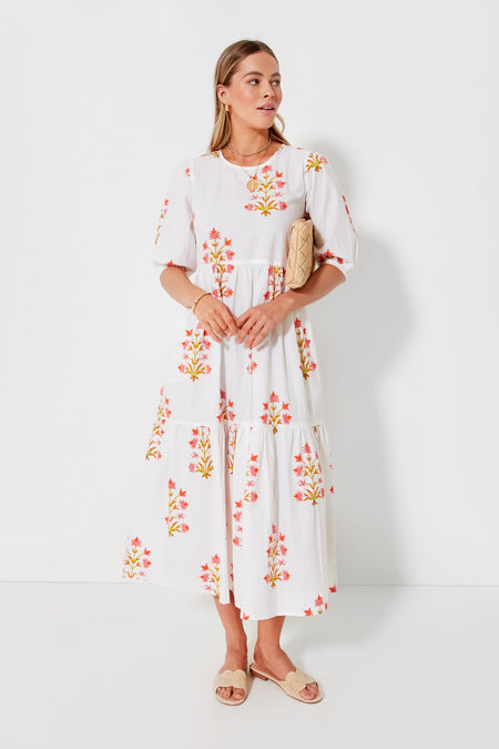With three tiers falling to ankle length, you'll be wafting around in the Exclusive Soft Rose and Tangerine Lily Print Gaia Dress for the entire warm weather season. An intricate pink floral print with hits of citron and soft green tones is hand block printed on SZ Blockprint's slightly thicker cotton to allow for maximum wearability throughout the years to come. Designed with an exaggerated puff sleeve that adds a bit of flair to this easy shape, we are wearing this every and anywhere, from school drop off to afternoon drinks with the gals.