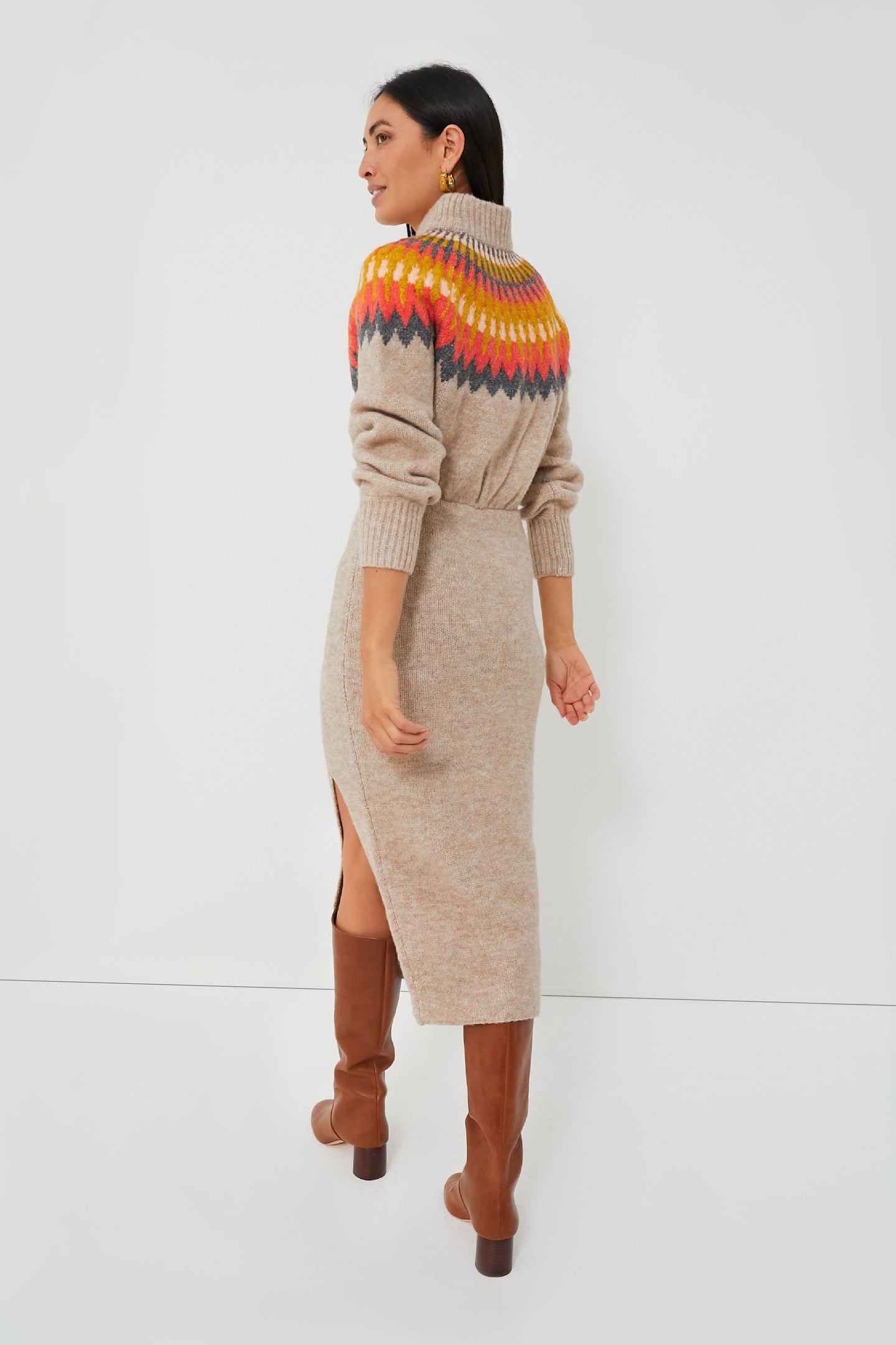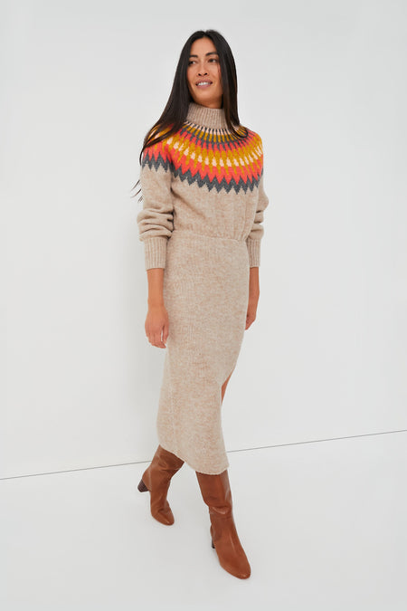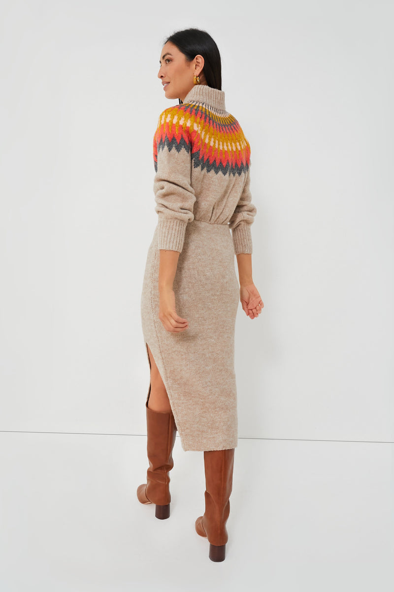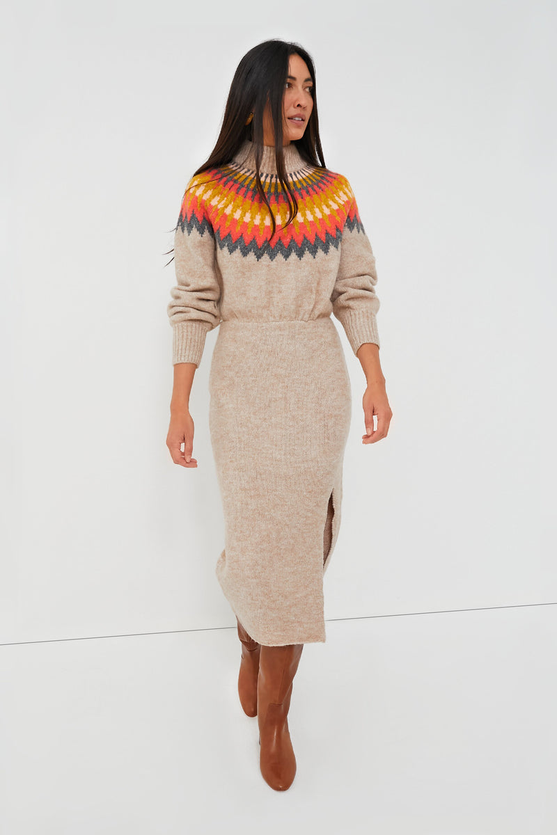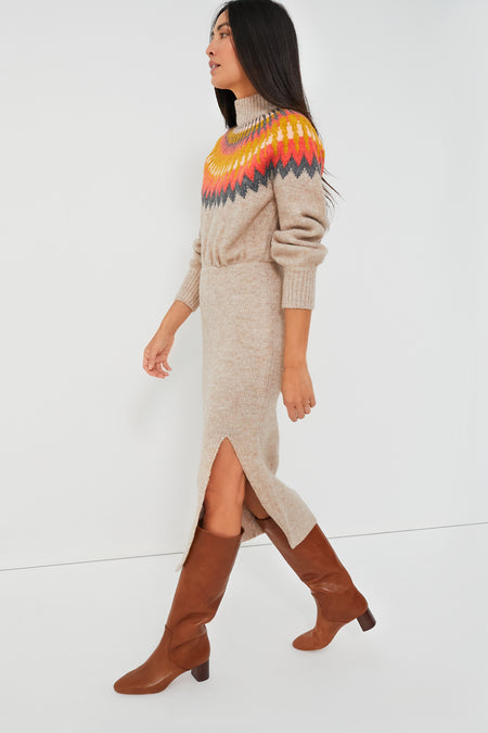 Love a good sweater but looking for an extra bit of polish? The Fall Multi Boshi Dress combines all the cozy aspects of a go-to knit with a touch of sleekness to create a special silhouette you'll return to time and time again. A ribbed turtleneck and a multicolor Fair Isle motif across the chest and shoulders gives off fireside relaxation energy, while a fitted skirt and a side slit hem brings a sultry element suited for date night. Pair with boots and gold jewelry for chicest results.