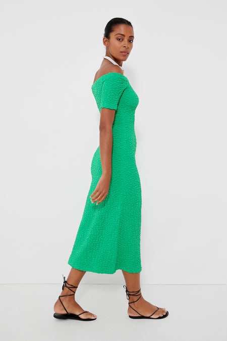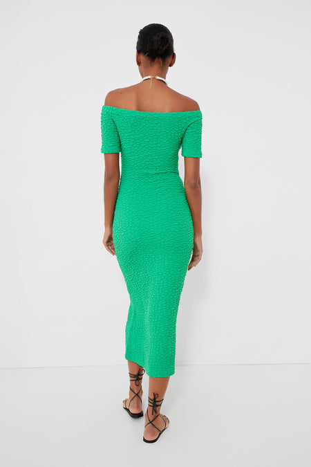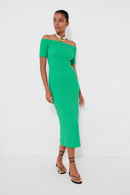 The JuJu Dress is one of a kind. This quirky and cool stunner stands out with an ultra-stretchy, bubble texture fabric and a sleek off-the-shoulder neckline. Slim in nature, this silhouette drapes beautifully on the body in all the right places and features a striking green hue. Style with open-toed heels, statement earrings, and a metallic clutch for your next event or outdoor wedding!