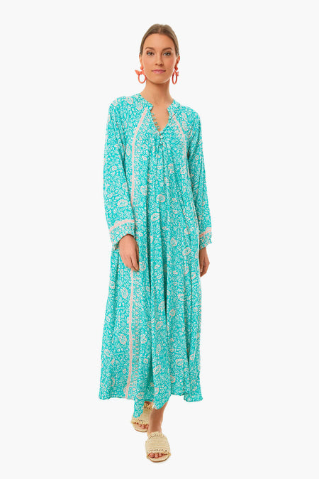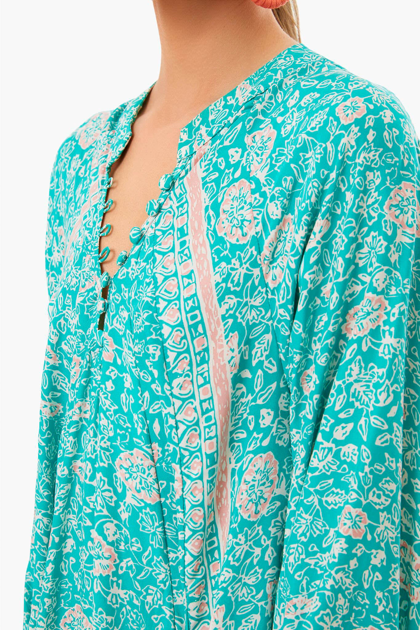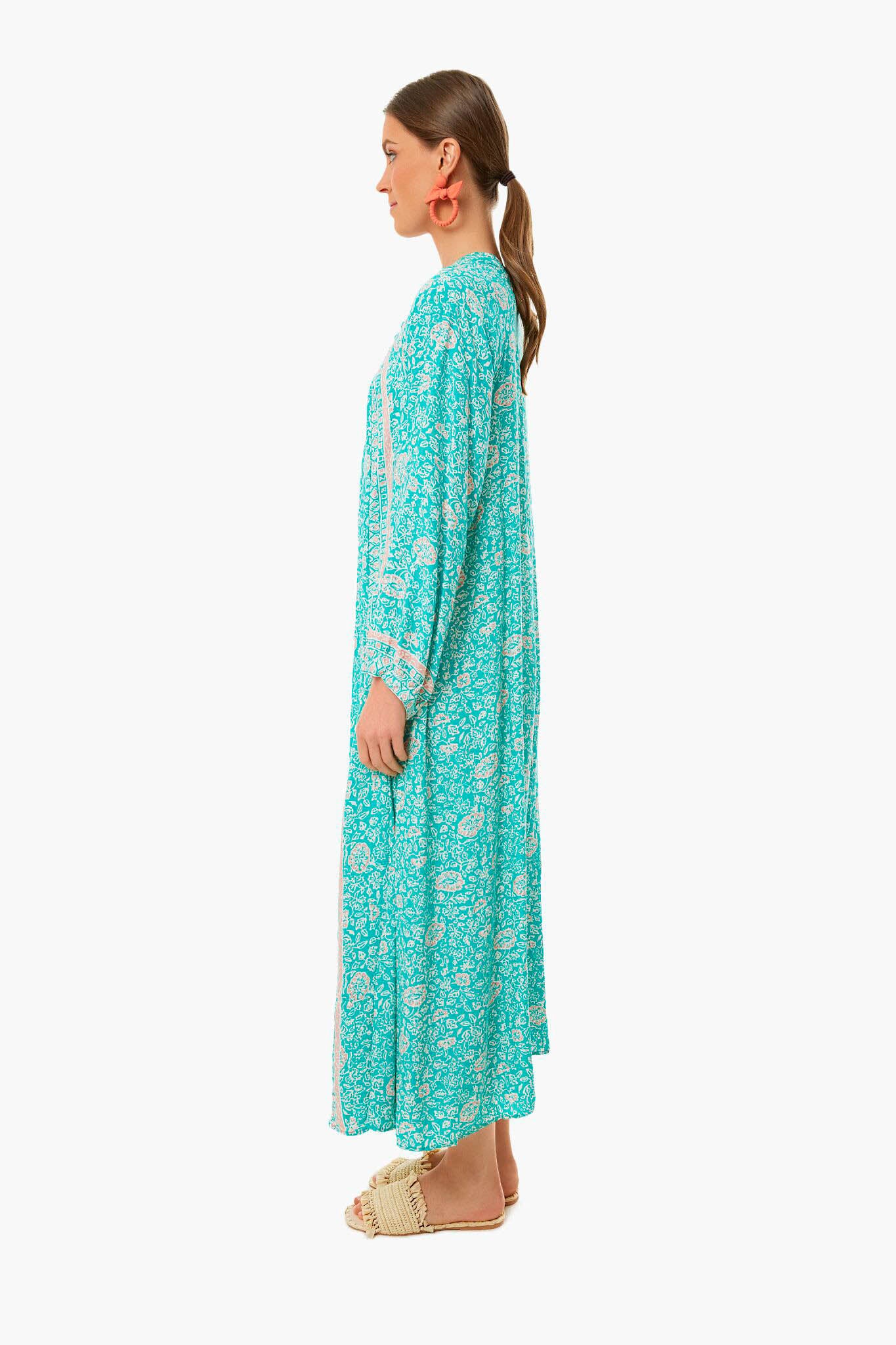 The Floral Print Amalfi Sea Fiore Maxi is an A-line dress with voluminous long sleeves. A deep v-neckline with covered buttons adds bohemian flair. Add sandals and statement jewelry from beach to date night!