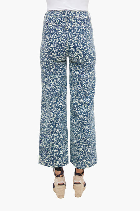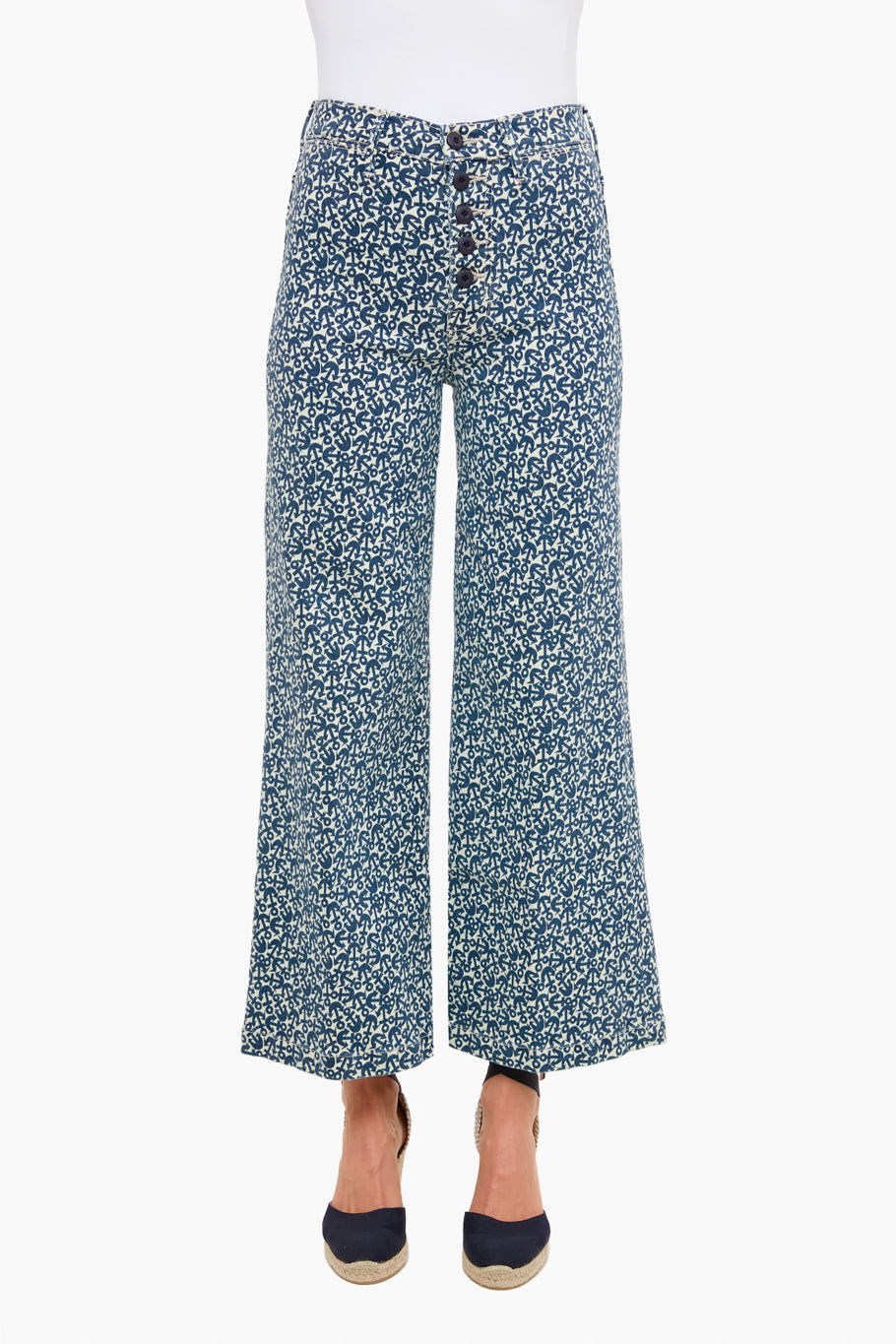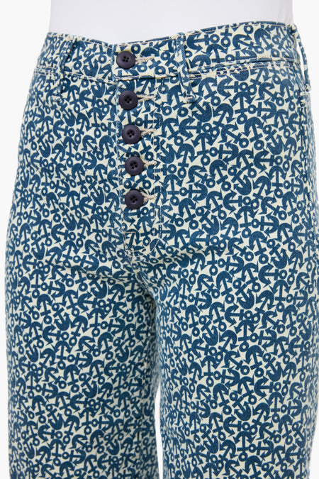 Anchors Aweigh! These high-waist flare jeans have an ankle-length inseam, exposed button fly, and hidden front slit pockets. Made from a soft, stretch denim in an off-white hue with an anchor-print pattern in navy blue, these are a whimsical and coastal addition to your wardrobe.