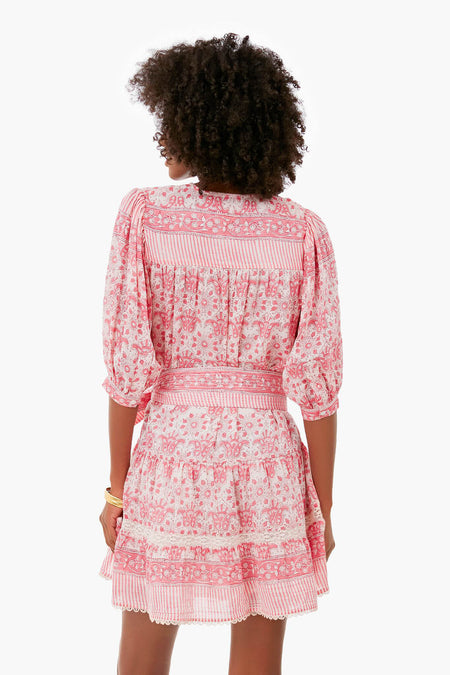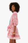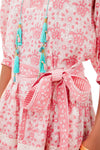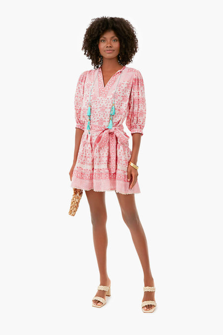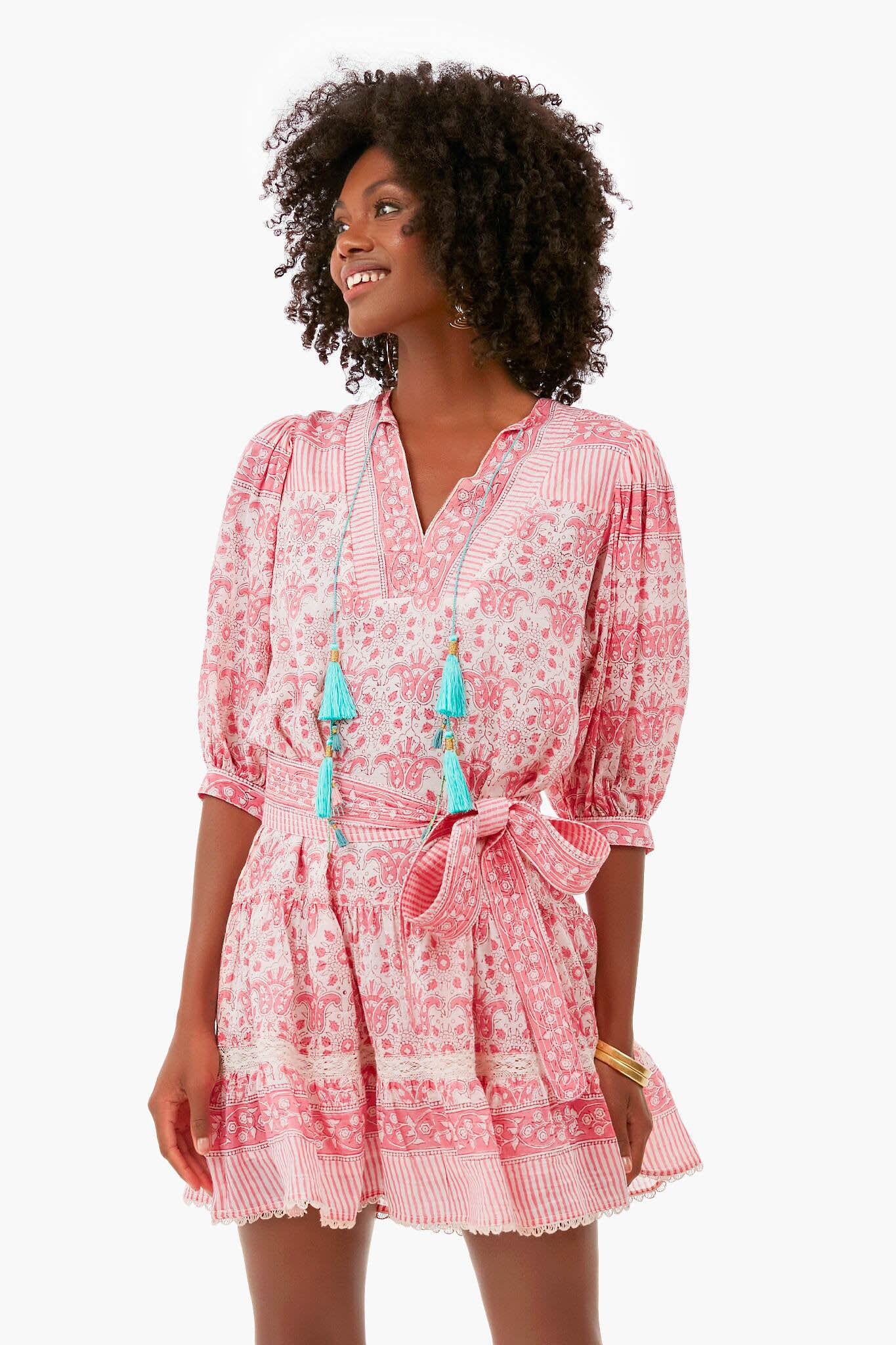 The Fran Mini Dress is hand block-printed in India on the softest cotton silk voile. Featuring a v-neckline with handmade tassel ties, elbow-length puff sleeves, and a self-tie belt, this short style is flirty, beachy, and bohemian. Add raffia sandals and gold jewelry from desk to drinks!
