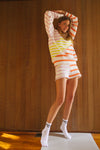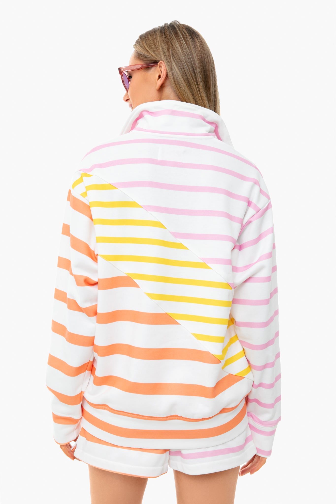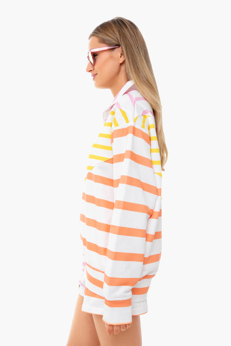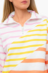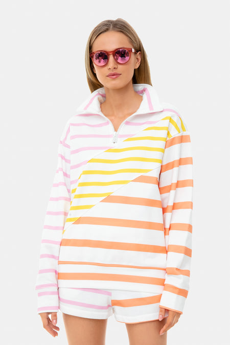 The French Terry Pullover is a vibrantly striped quarter zip. Oversized and lightweight, this style is chic and comfortable for lounging at home, at the park, or on a beach. Pair with the matching shorts for a retro, sun-kissed look.