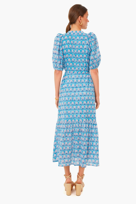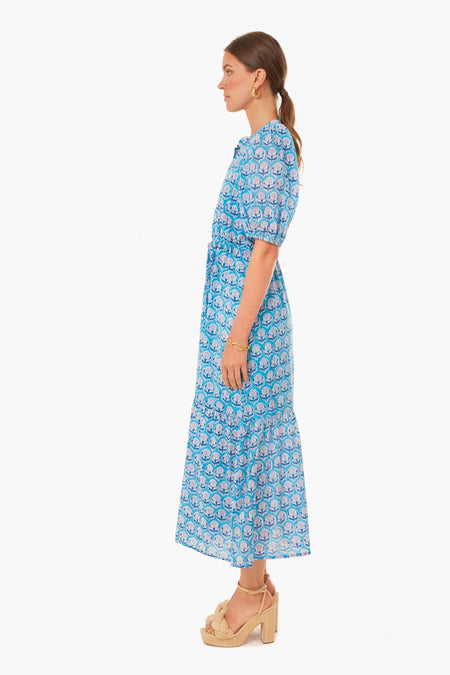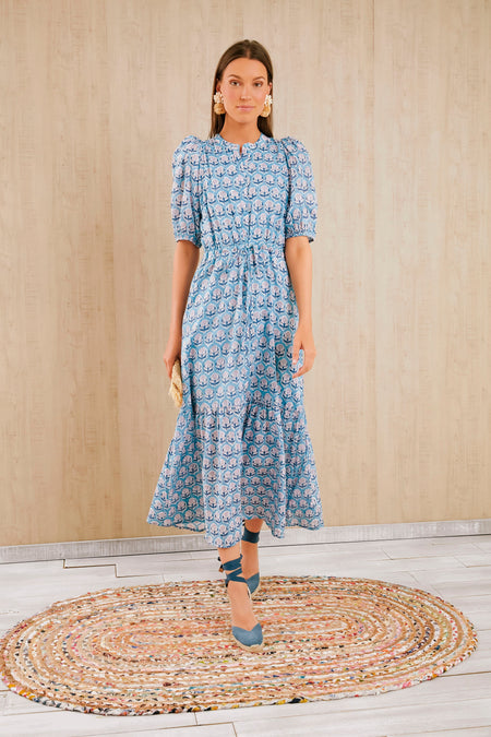 Made from hand block printed organic cotton, the Friday Flowers Lucy Dress is our go-to, easy breezy warm weather dress. This number features a mandarin style collar, subtle puff shoulders, button front placket, and a drawstring waist. Pair this style with heels and raffia accessories for a cool and relaxed look all season long.