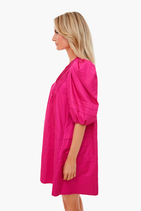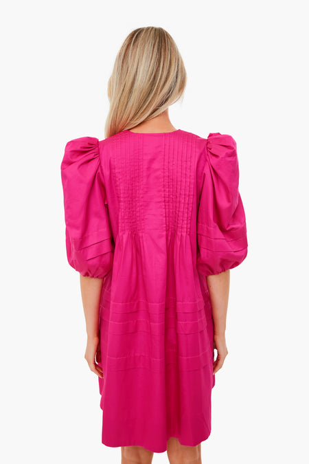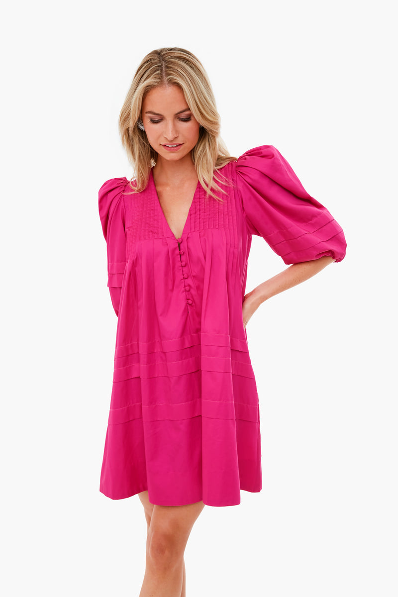 The Jenkins Dress is made from a bold fuchsia fabric with a covered button placket. Featuring dramatic puff shoulders, a v-neckline, and ballet-length sleeves, this style is playful and elegant. Add sparkling accessories for a holiday party!