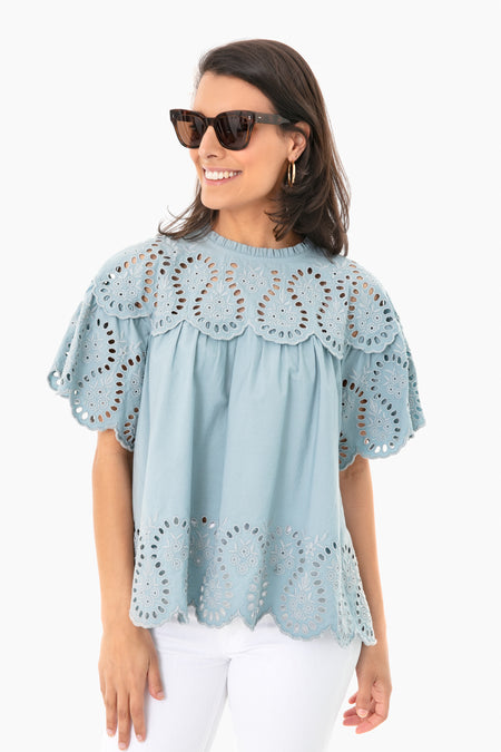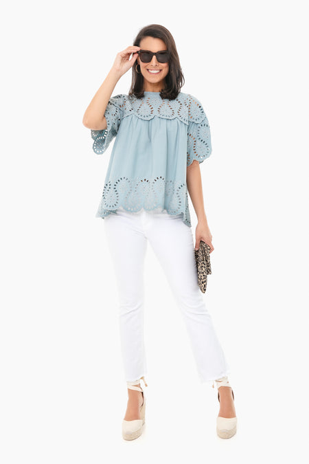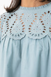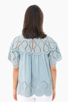 The Glacier Marina Short Sleeve Top features sheer eyelet detailing around the neckline, hems and sleeves. Made from a beautiful blue cotton fabric, this top is both lightweight and flowy, making it ideal for hot summer days.