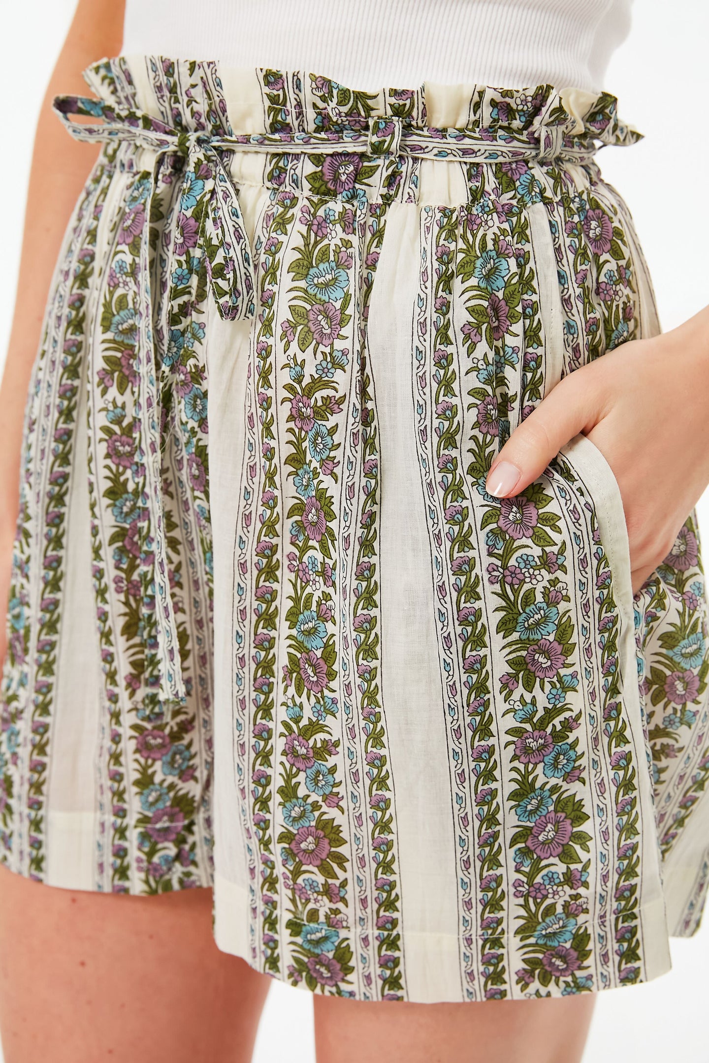 Effortlessly easy to wear anywhere, the Goa Stripe Cary Shorts are a must-have in any closet. Crafted from cotton and detailed with a tropical print in an understated color scheme, these breezy bottoms have it all — a flattering high rise, a paper bag waist with a drawstring belt, and side seam pockets to help you go hands-free. Throw them on with a white tee and some sandals for a day of seeing the sites while showing off those newly suntanned legs, and add a button down or denim jacket on top to watch the sunset.