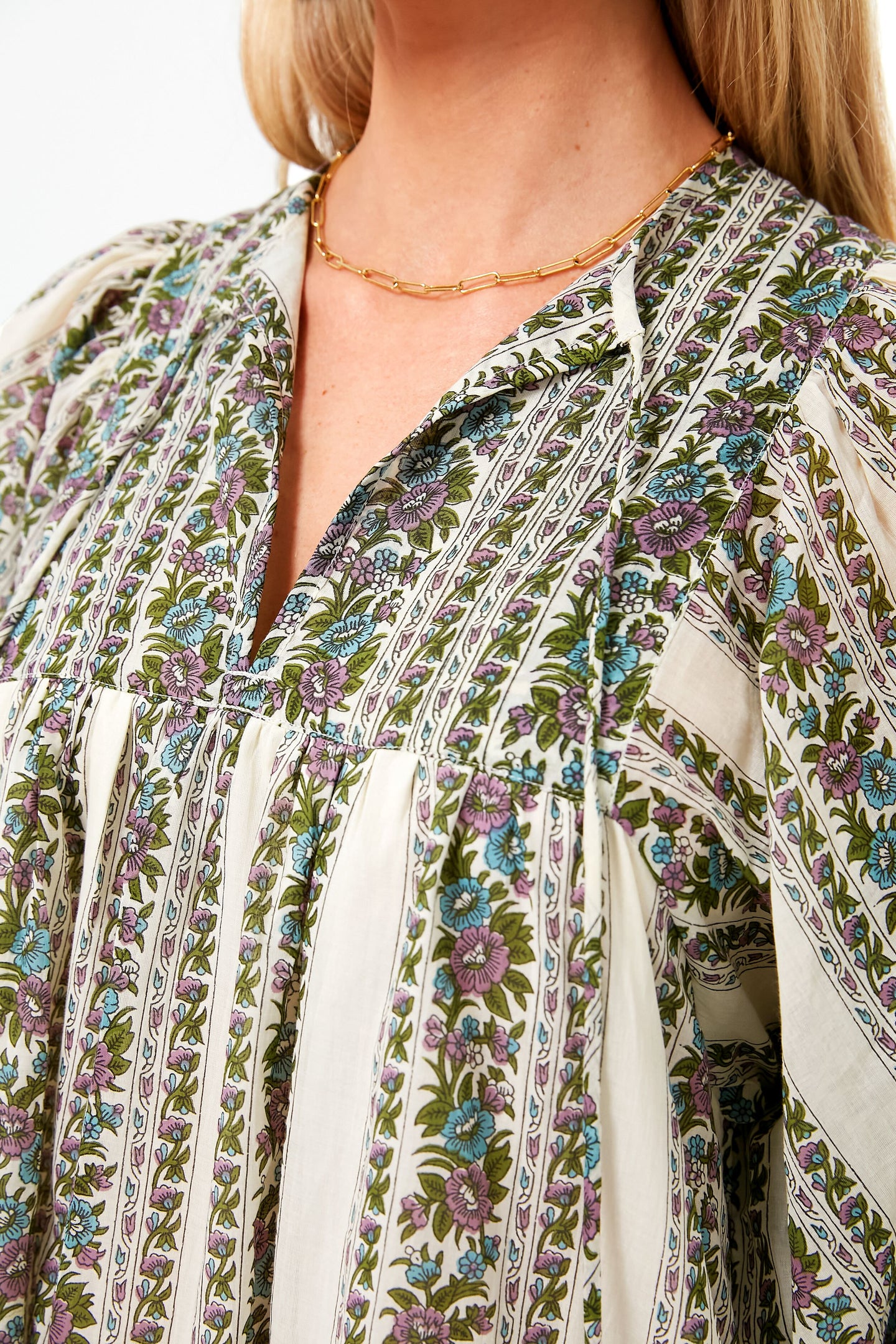- Three-quarter length blouson sleeves