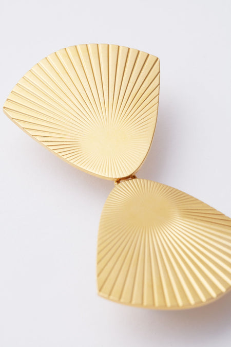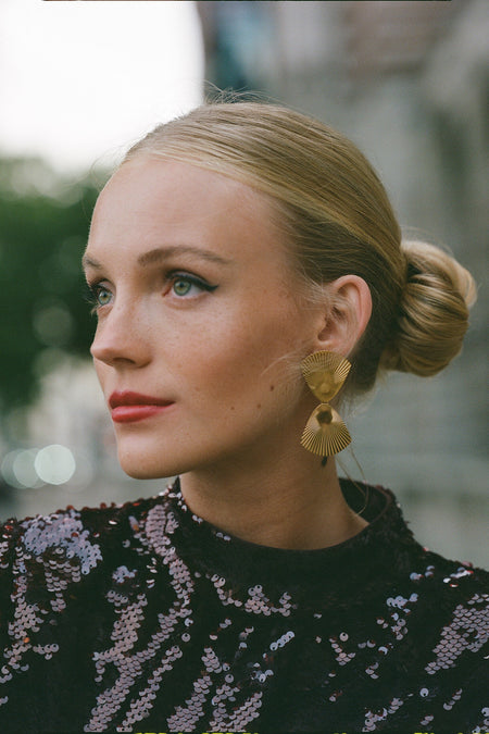 The Gold Malorie Earrings add a vintage twist to your modern-day wardrobe. Inspired by the art deco era, these stunning statements are made from gold-plated brass with a textured sunburst detail. With an eye for detail, the post placement was carefully considered for optimal ear coverage. Top off your party dress with these glam earrings and you’ll be sure to shine all night long.