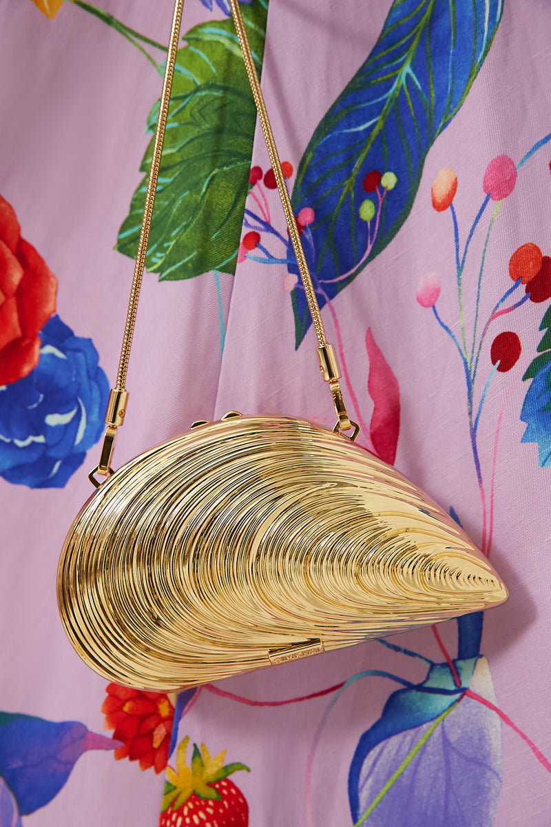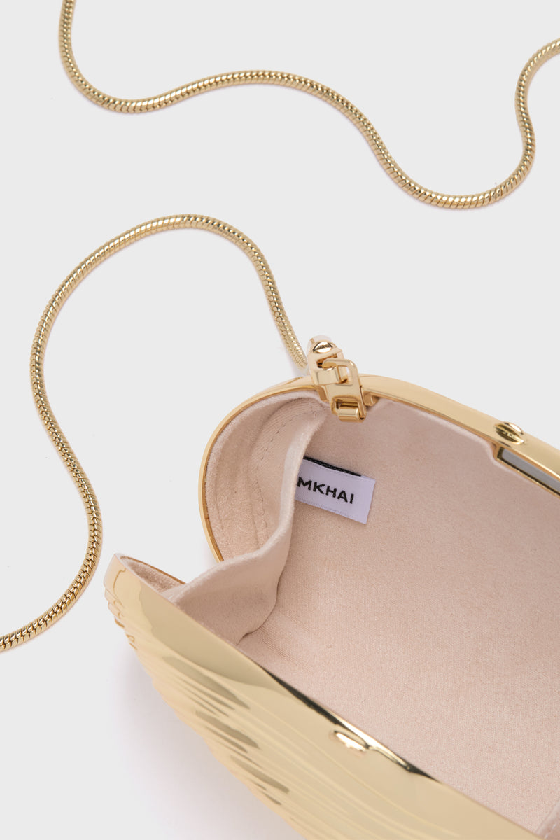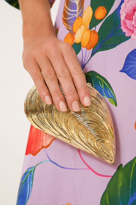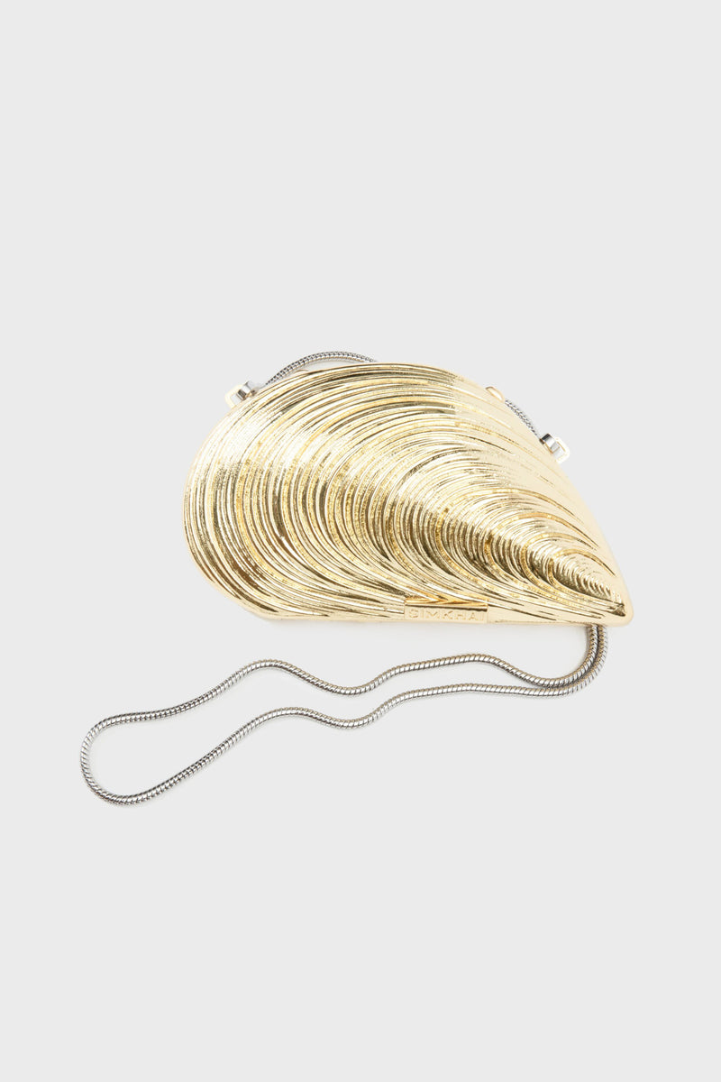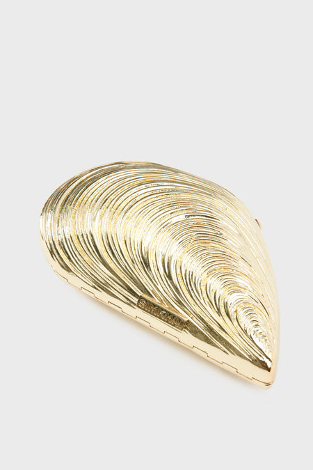 Complete any sophisticated party look with a perfect finishing touch like the Gold Mini Bridget Oyster Shell Clutch! Cast from metal and designed as a hardshell clamshell case elegantly shaped like an oyster, this glamorous piece has satin lined interior and is perfect for storing your night-out essentials, while a detachable gold chain allows you to style it as a crossbody!