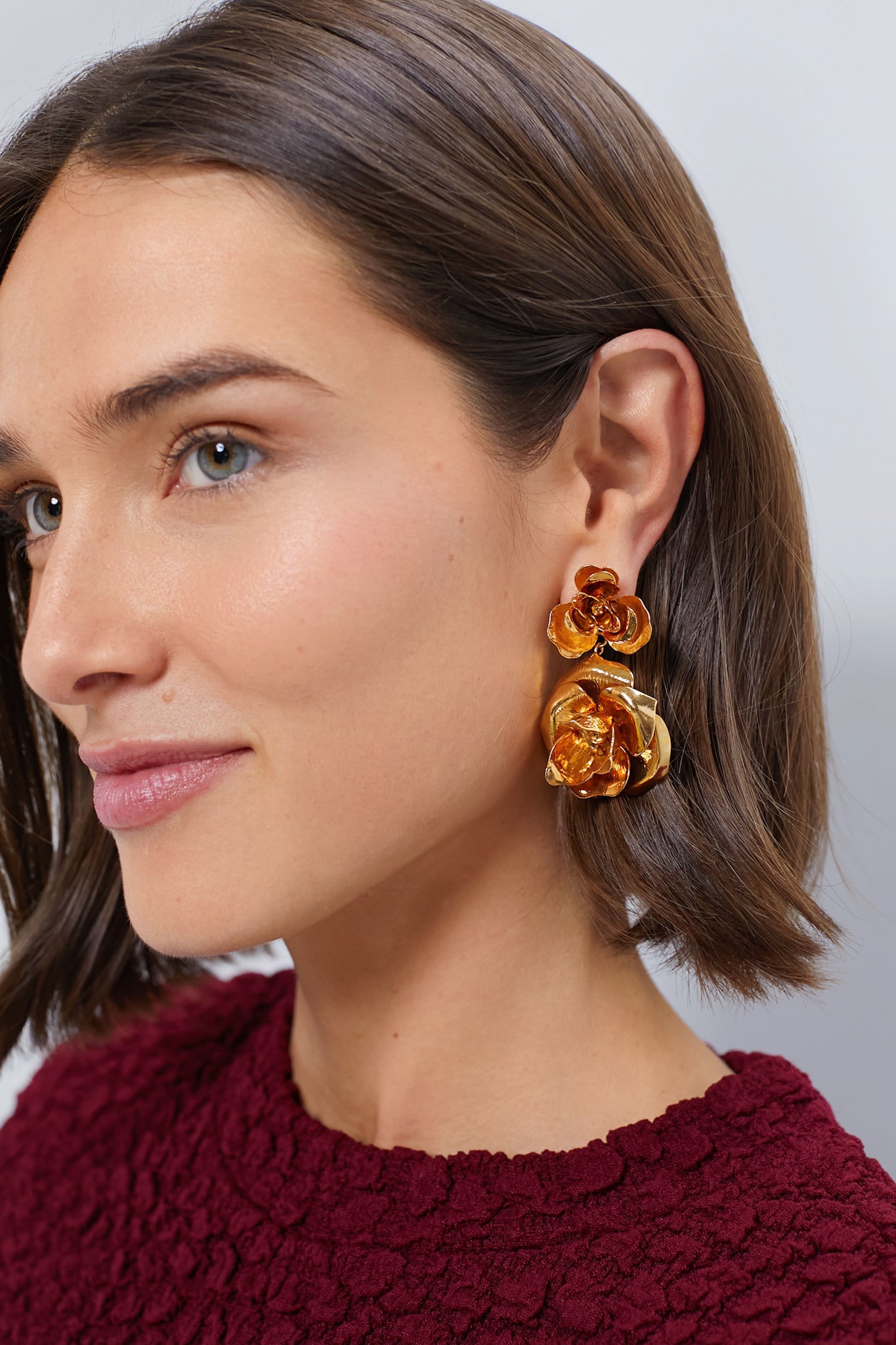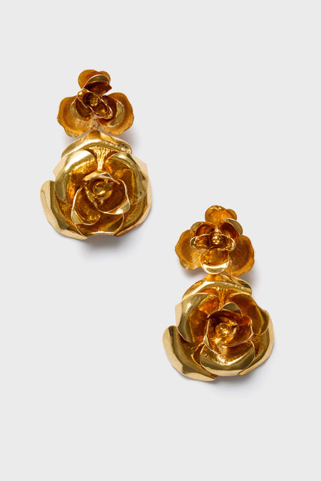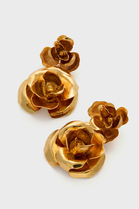 the Gold Rosie Earrings are a sculptural tribute to nature's most romantic bloom. Each stud showcases a pair of cascading garden roses in full bloom, vividly sculpted to create stunning texture and depth. Pair them with any ensemble for a striking look.