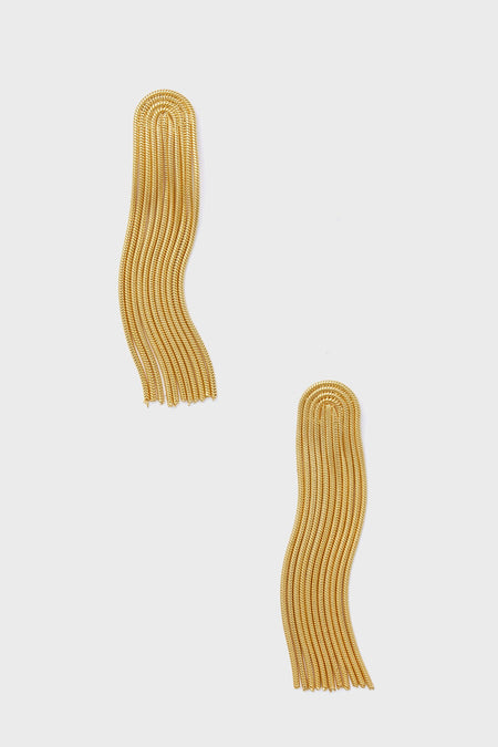 We love the glamor of the Gold Trento Earrings. Chain fringe shimmers with every step on dramatic U-shaped drop earrings finished in gleaming gold making these the perfect eye-catching piece for parties and events. Pair with a simple black dress or add to the prism with a colorful maxi and heels!