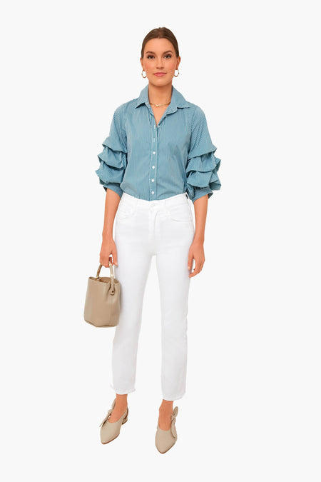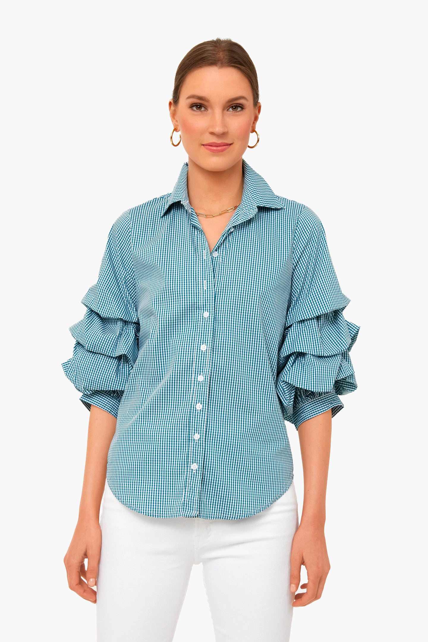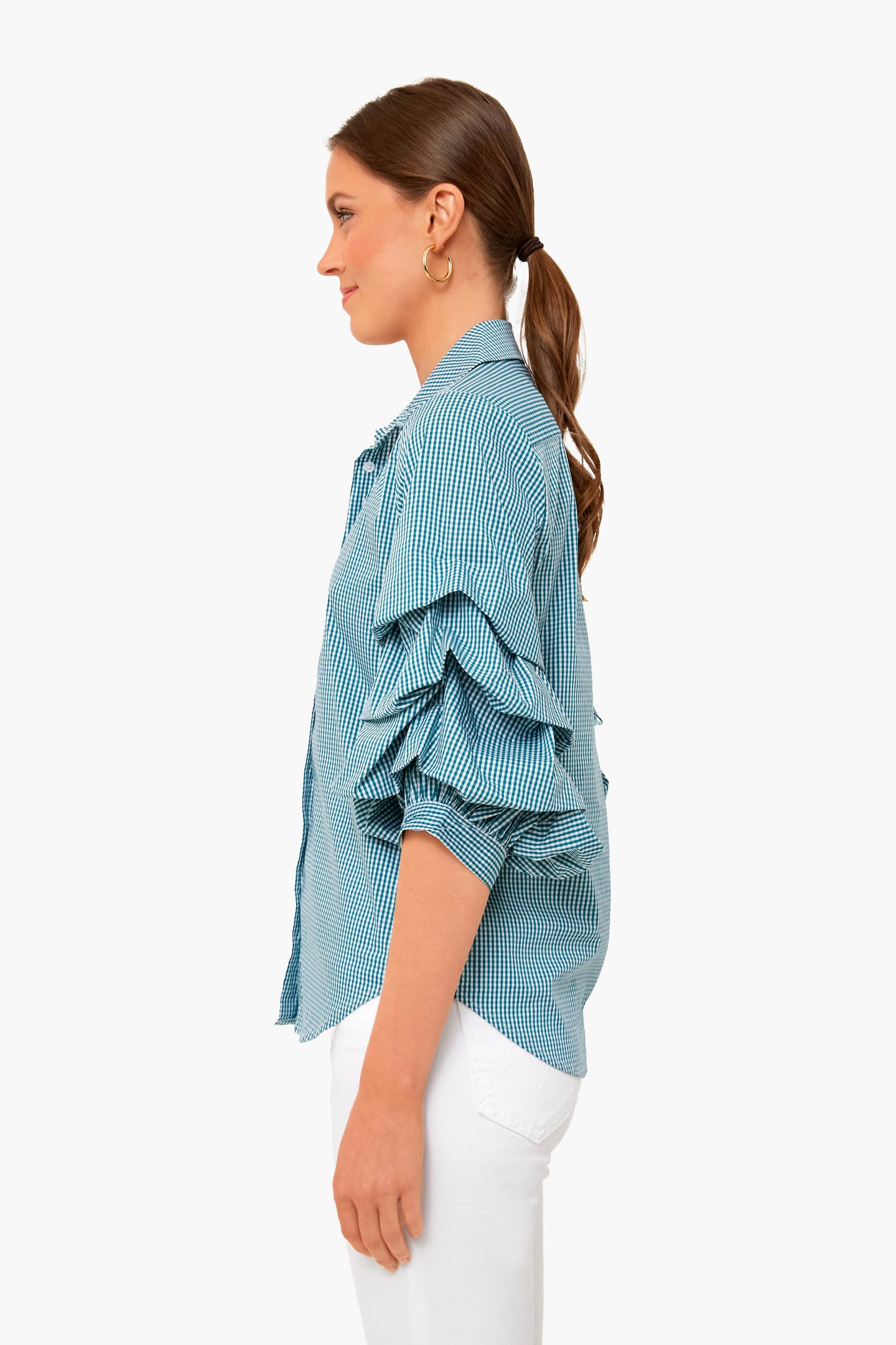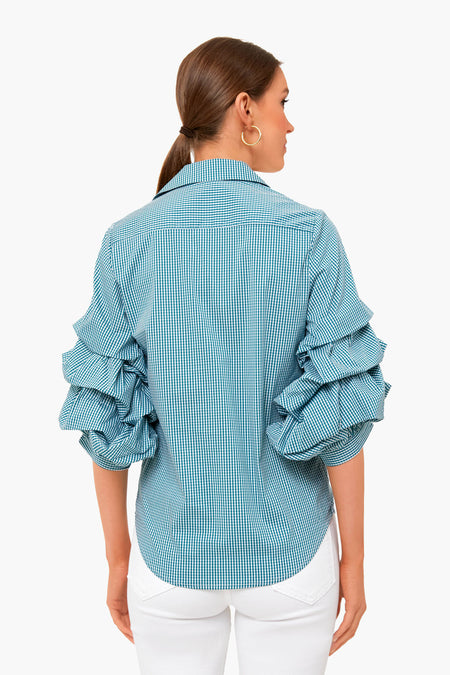 The Green Check Seville Shirt is made with dramatic, yet wearable puff sleeves. Reimagined for the perfect fit- powered by No Gape® button technology, it is patented and designed by Rochelle Behrens to eliminate blouse gape. Pair with denim and statement earrings from desk to drinks!