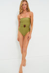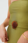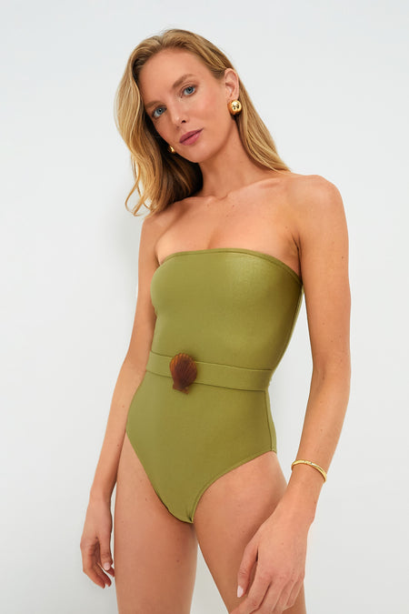 The Green Dune La Mer Swimsuit is equal parts retro and modern. This strapless one-piece silhouette features a straight neckline, belted waist, and a seashell buckle. Pair with sandals and a sun hat for a look that will be the belle of the beach!