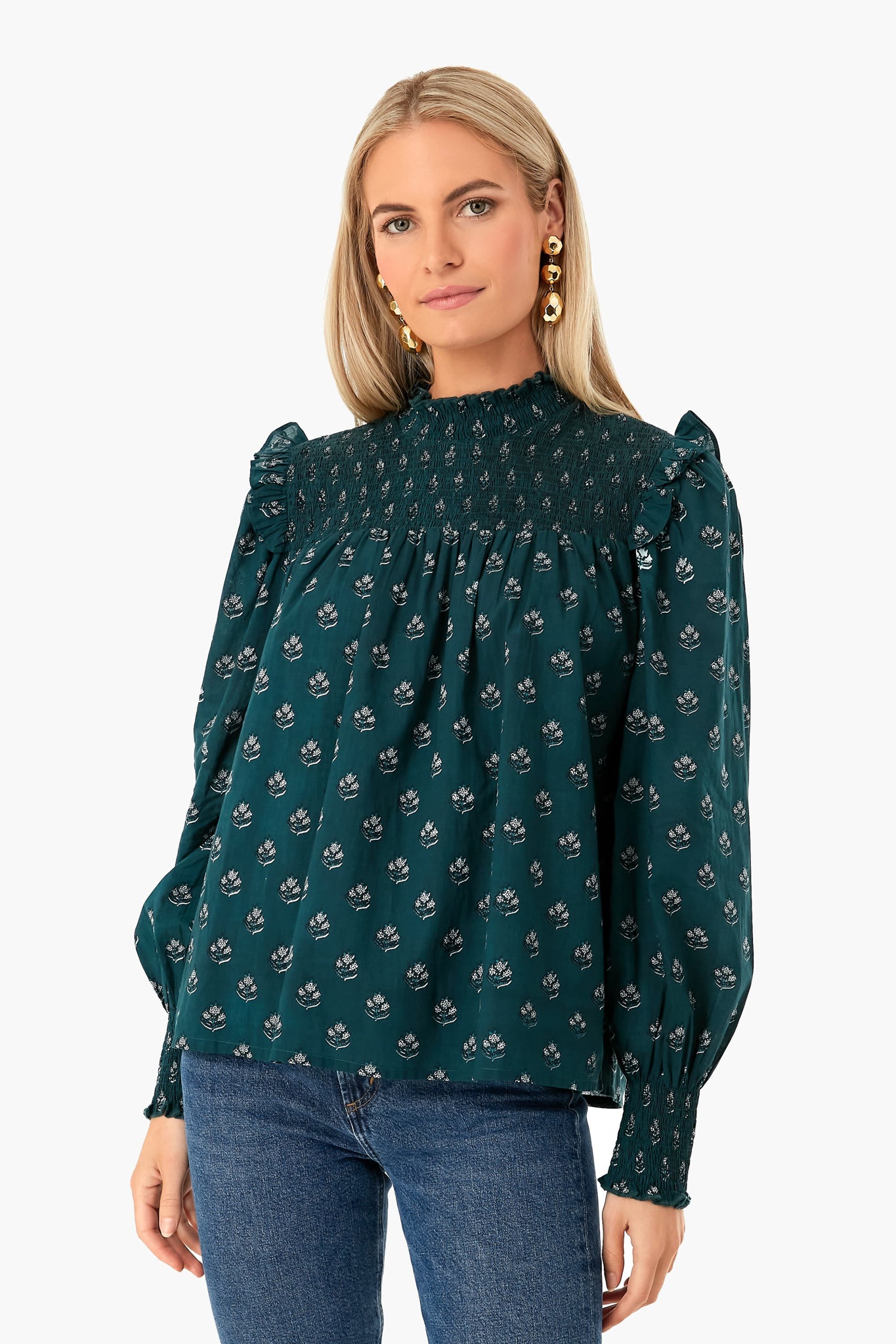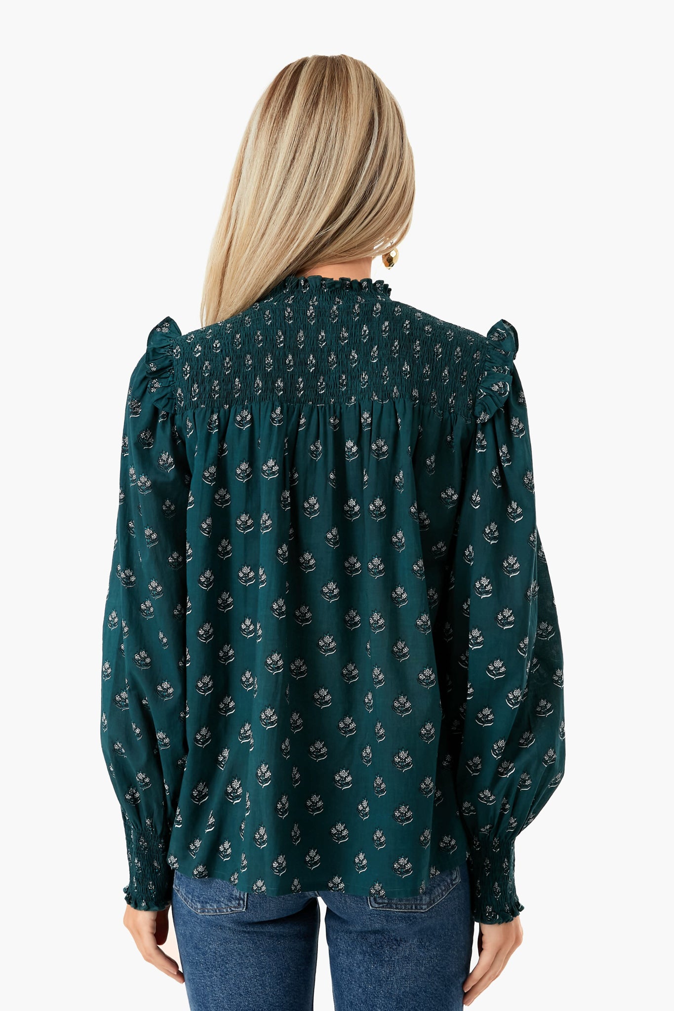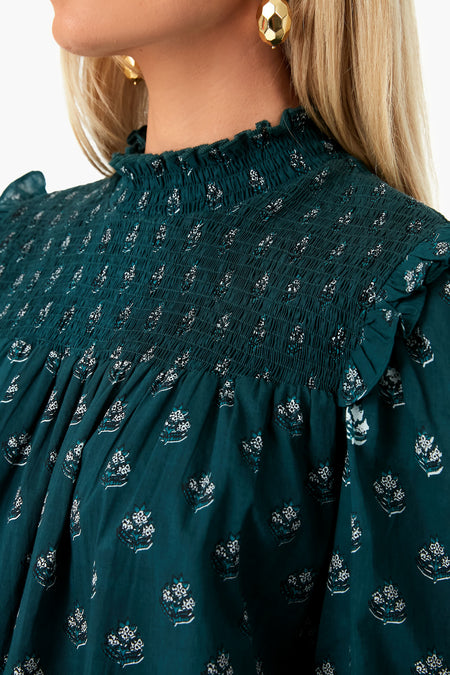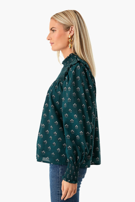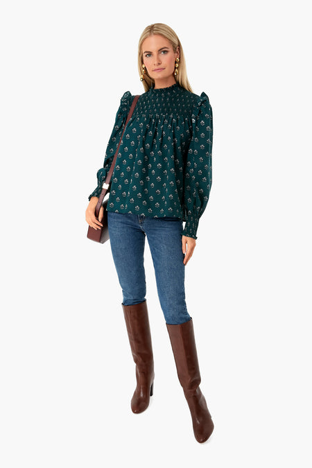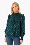 It's all in the details for the Green Indira Gama Top. In a deep forest hue, featuring smocking details at the yoke and cuffs with flutter trim on the shoulders, this blouse is perfect for anything and everything, desk to drinks, day to night – the possibilities are endless. We love to wear this with boots in the fall and winter and swap for white denim and sandals for vacation and warmer months ahead.