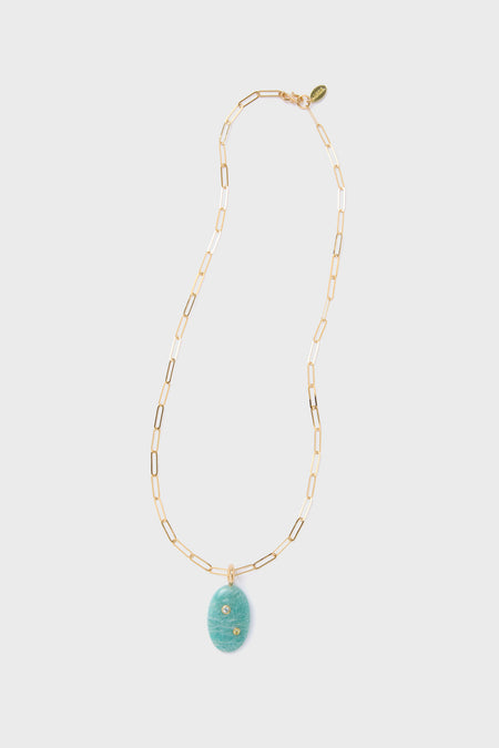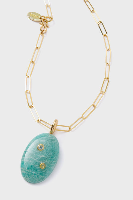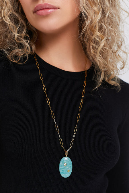 Named for the trailblazing dancer Isadora Duncan, this gold-plated sterling silver paperclip chain necklace featuring a large amazonite pendant inlaid with sky blue topaz and peridot semiprecious stones, this bauble pairs beautifully with everything from dresses to sweaters and is perfect addition to your fall-wardrobe this season.