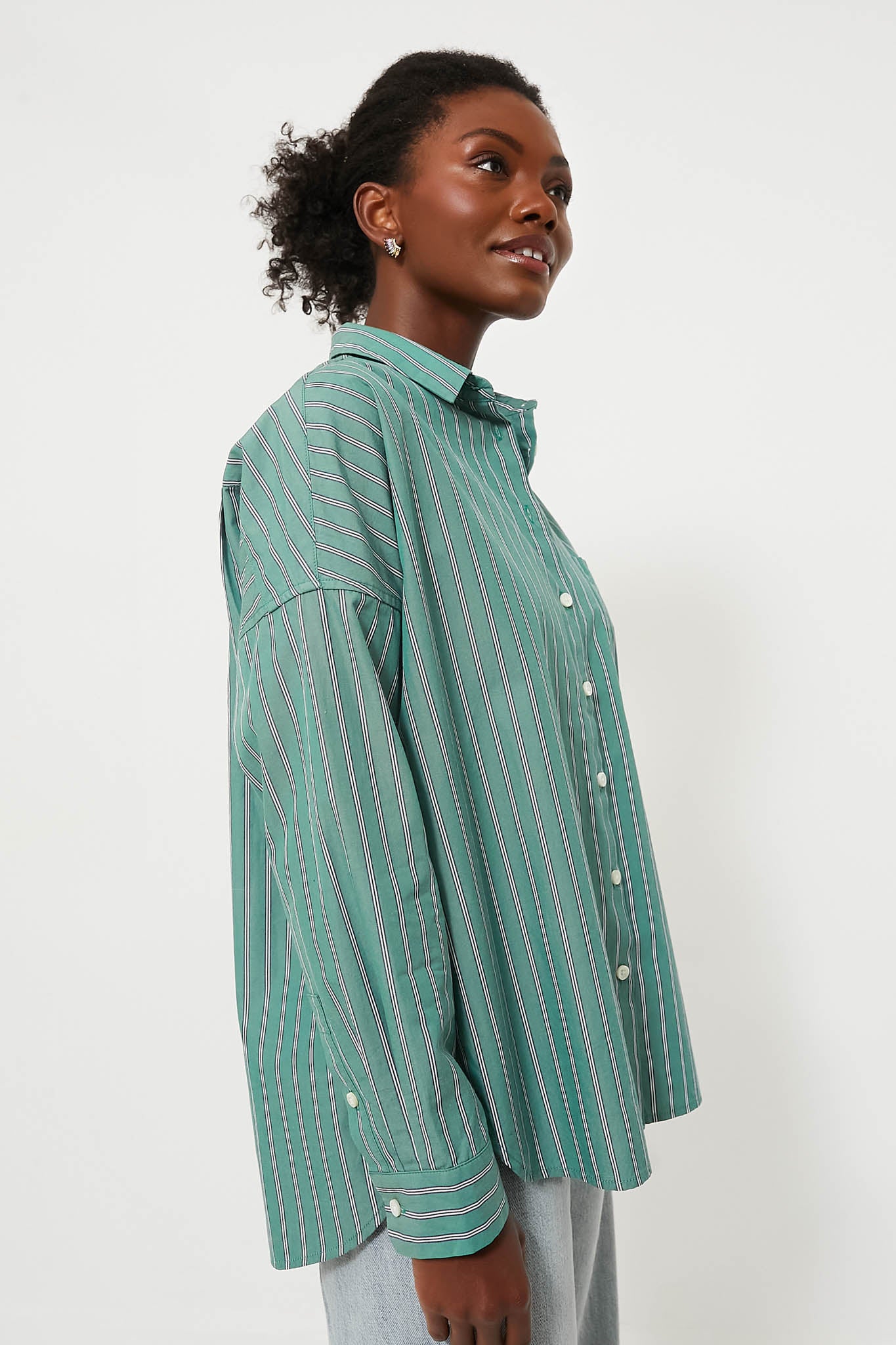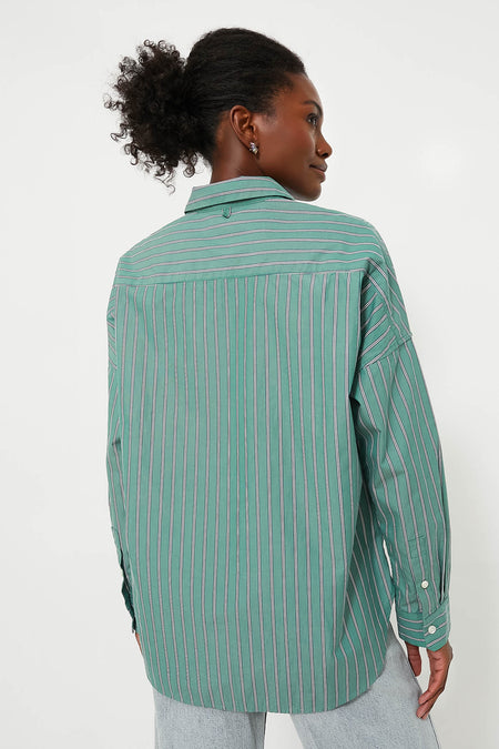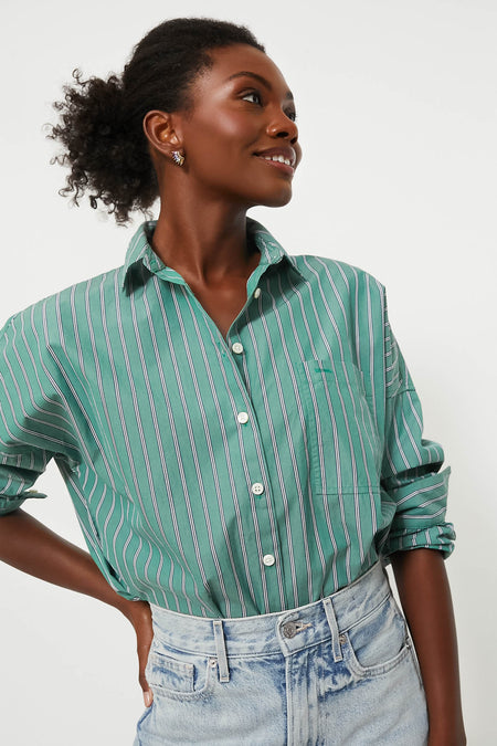 The Green Jo Shirt is a season-less number your wardrobe needs. Crafted from striped poplin and designed to have the perfect length that looks great tucked in or left out, we love to style it with high waisted shorts and sandals for an elevated everyday look, with denim and sneakers for casual comfort, or with trousers and loafers for an office outfit.