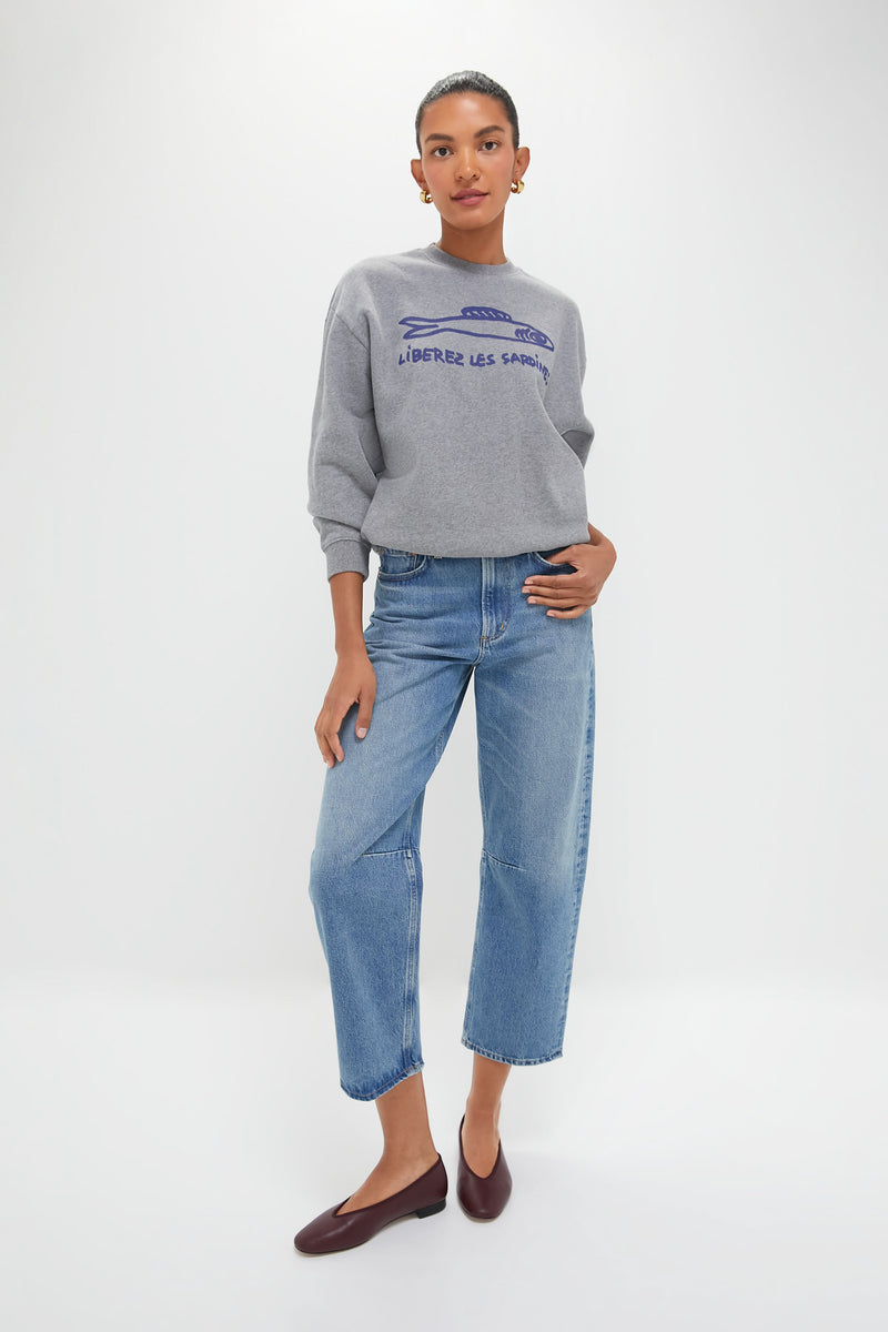 The Grey and Navy Liberez Les Sardines Oversized Sweatshirt is perfect for casual wear. With a relaxed, oversized fit and drop shoulder, this fun and nautical inspired sweatshirt is perfect for weekend wear with jeans, or packing in your carry on for chilly evenings on your next trip!